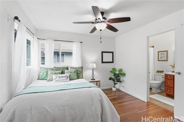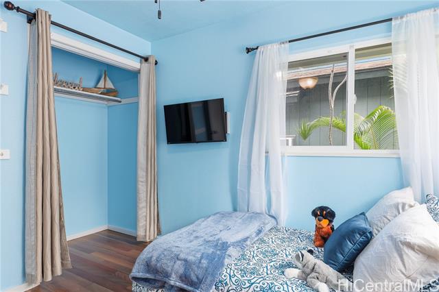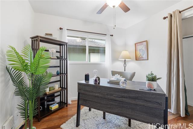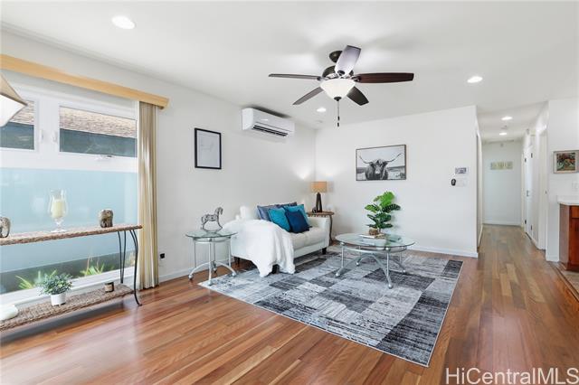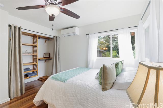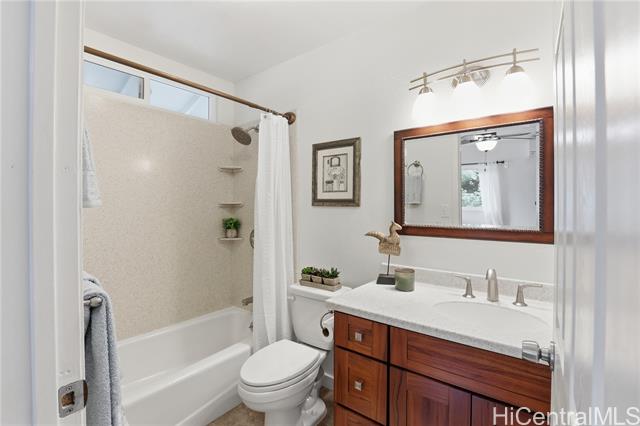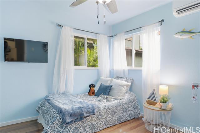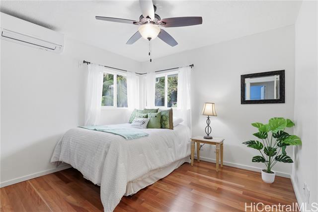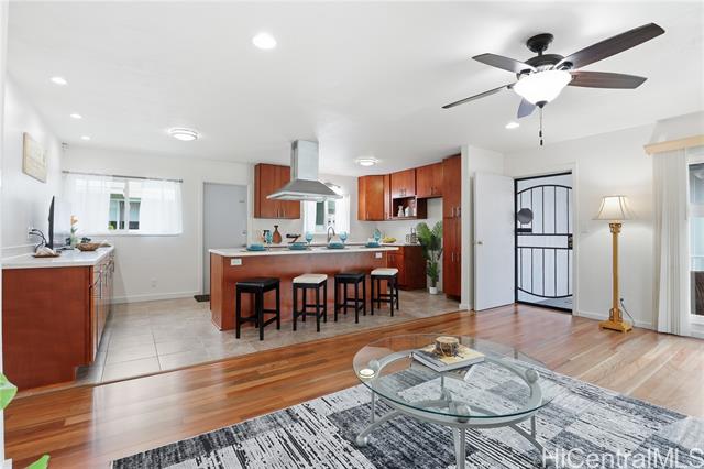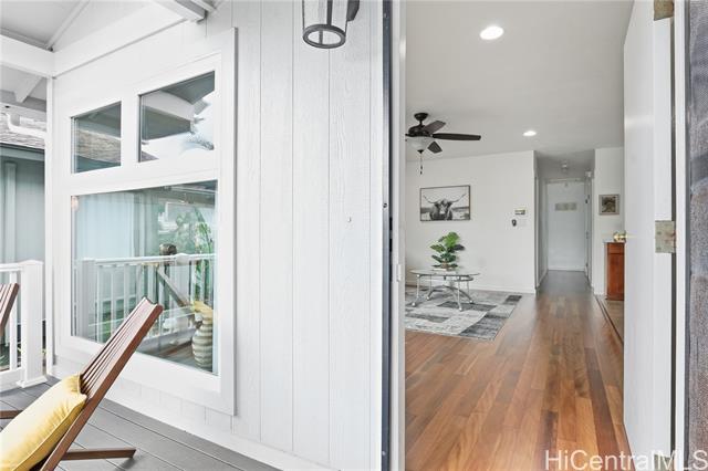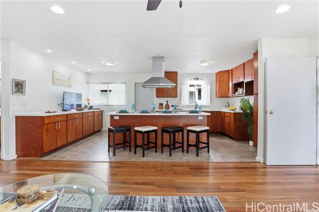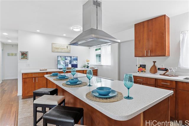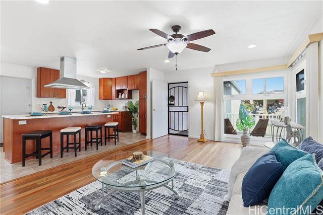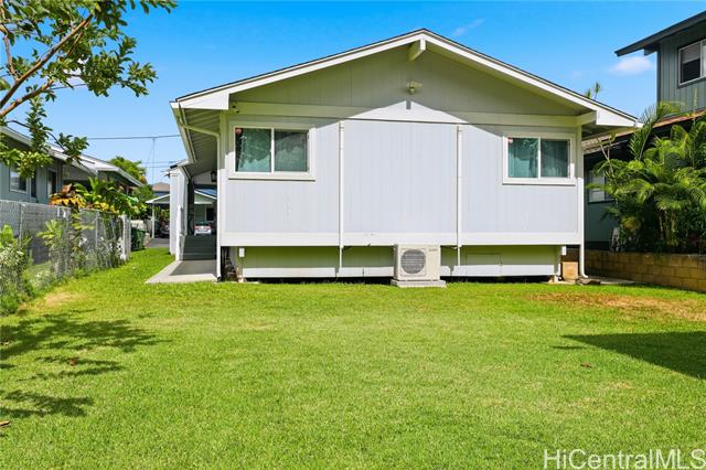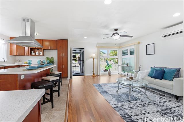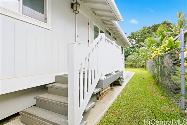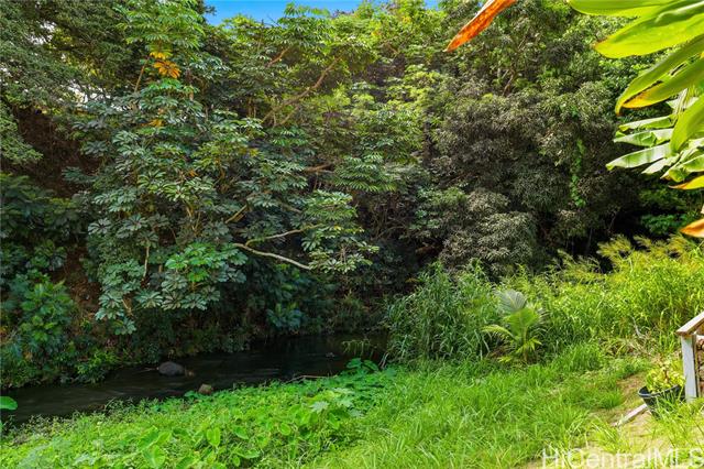 Beautifully updated single-level 3-bedroom, 2-bath home in the heart of Kaneohe! Featuring hardwood and ceramic tile flooring, updated kitchen and baths. Enjoy year-round comfort with split A/C, 19 owned PV panels, and a Tesla Powerwall for energy efficiency and peace of mind. The open kitchen includes warm wood cabinetry, solid-surface countertops, and a spacious island that adds extra seating and counter space-perfect for gatherings or entertaining. Step outside to the backyard with fruit trees including mango, Tahitian lime, calamansi, Hawaiian vi, and guava and a peaceful stream. Additional features include an alarm system, new storage shed, and a 2-car carport with driveway parking for 4 cars or 2 cars and a boat. Conveniently located near Windward Mall, Windward City Shopping Center, restaurants, grocery stores, and Kaneohe Bay. No HOA fees or restrictions-just easy island living at its best!