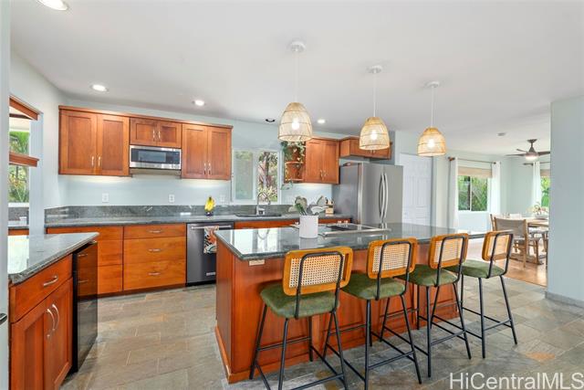 Come see this amazing coastal retreat with ocean & mountain views in scenic Kaaawa. Experience the best of country living with breathtaking ocean and mountain views. This turn-key home, built in 2007, offers a thoughtfully designed layout with 2 bedrooms and 2 bathrooms upstairs, featuring an open-concept kitchen, spacious living area, and a spa-like primary suite. The downstairs level includes a separate 1-bedroom, 1-bath unit with wet bar/kitchenette, ideal for guests, extended family, or rental possibilities. The gated property provides privacy, ample parking, and is surrounded by lush tropical landscaping that enhances the serene setting. Move-in ready and designed for both comfort and flexibility, this home is a true retreat on Oahu’s Windward Coast.
