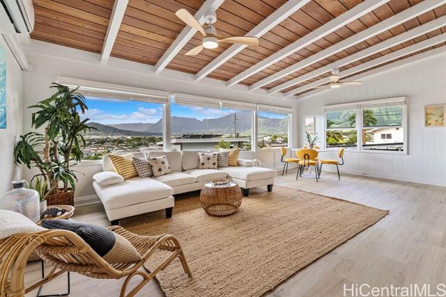 Welcome to lush, green Kaneohe! This newly refreshed property, with stunning Ko’olau mountain and peak-a-boo ocean views, boasts modern updates inside and out, including vinyl windows, updated kitchens and baths, stylish vinyl plank flooring, and fresh paint throughout. With 48 owned photovoltaic panels, a hybrid water heater, and 4 Tesla Powerwalls, this spacious home is perfect for multifamily living or as an income-producing property. The newer roof provides peace of mind, while the large lot offers ample space for outdoor activities and entertaining.This wonderful home comes with City and County permits and approved plans to build a spacious ADU (Accessory Dwelling Unit) for rental income, extended family, or a home office. The proposed ADU is designed as a separate, freestanding cottage offering privacy and convenience. Enjoy easy access to the home from two different driveways and plenty of parking. Don't miss out on this incredible opportunity to own a piece of paradise in Kaneohe! Please note that the bed and bath count do not match the tax records.