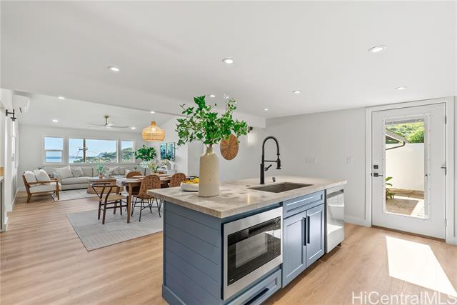 SUN OPEN HOUSE 2-5pm CANCELLED! Step into this beautifully renovated 3-bedroom, 2-bathroom single-family home in the serene Lulani Ocean neighborhood of Kaneohe. With breathtaking ocean views of Kaneohe Bay from nearly every room, this home combines modern design with classic Hawaiian charm. The kitchen features elegant Taj Mahal quartzite countertops, sage green shaker cabinetry, stainless steel appliances, and a separate wine/beverage station. Throughout the home, enjoy luxury vinyl plank flooring, porcelain tile in the bathrooms, and stylish accents like subway tile and marble mosaic niches. The bathrooms are equipped with high-end Kohler fixtures and matte black faucets. The spacious 2-car side-by-side garage features a high-end epoxy-coated floor with surfboard storage. Additional features include a laundry room with a sink, ceiling fans, and split AC units in every room. Don’t forget to check out the 3D walkthrough and property video to experience this exceptional, fully renovated home. Schedule your private showing today!