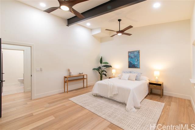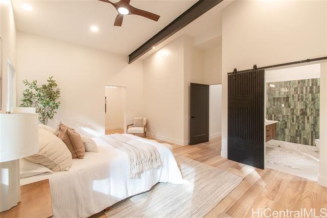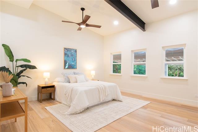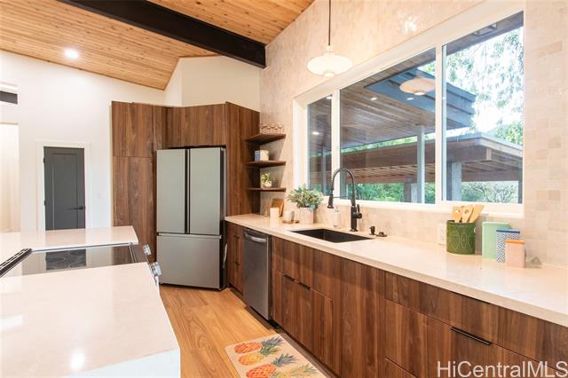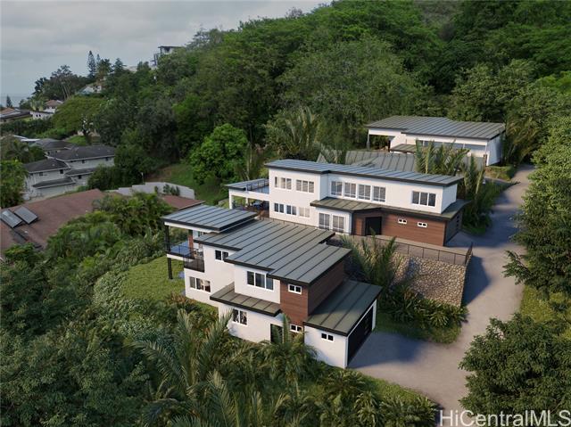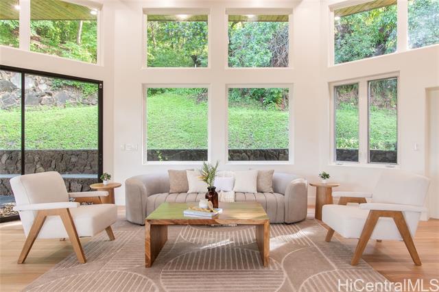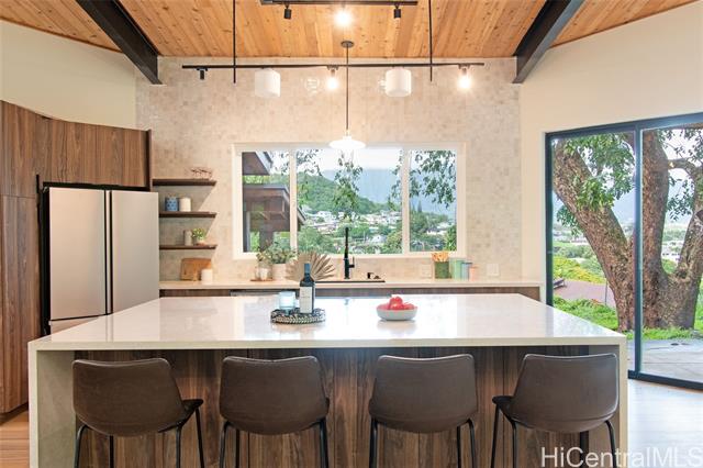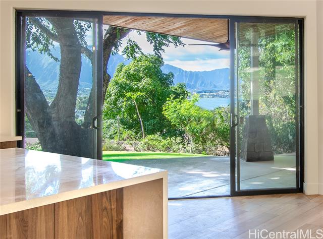 Welcome to the first residence in Ko'olau Kai, an emerging community where refined living meets natural beauty. Perfectly positioned to capture sweeping views of the Ko'olau and Kaneohe Bay, this home offers serenity, elevation, and effortless elegance. Soaring 20 foot cedar ceilings and stacked windows flood the space with natural light, framing lush greenery from nearly every angle and creating a bright, airy atmosphere throughout. The optimized design blurs the line between indoors and out, bringing jungle vibrance into daily living while the main space flows seamlessly to the lanai for true indoor outdoor living. The open concept kitchen features Quartz countertops and clean, elevated finishes, ideal for hosting or quiet evenings at home with a flowy layout. Spa inspired bathrooms include dual rainfall showers, pebble flooring, and layered lighting for a true retreat experience. The primary suite offers private backyard access with room to create your own wellness oasis whether a garden lounge, sauna, or cold plunge sanctuary. As sunsets light the mountains, the setting feels cinematic yet undeniably home. Ko'olau Kai is where a next chapter begins.