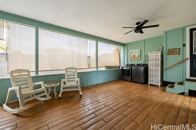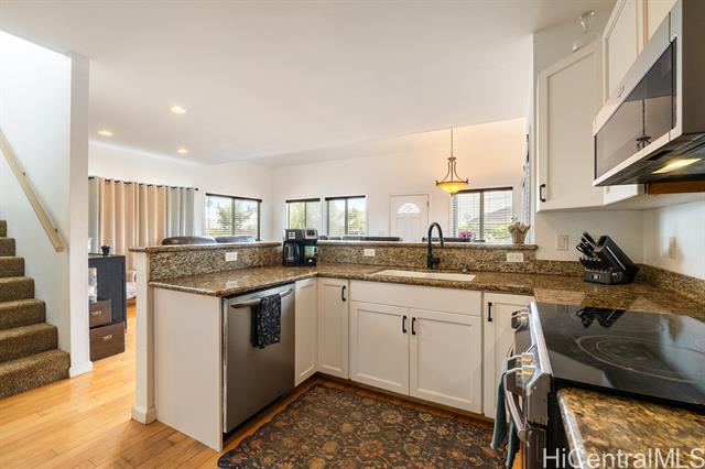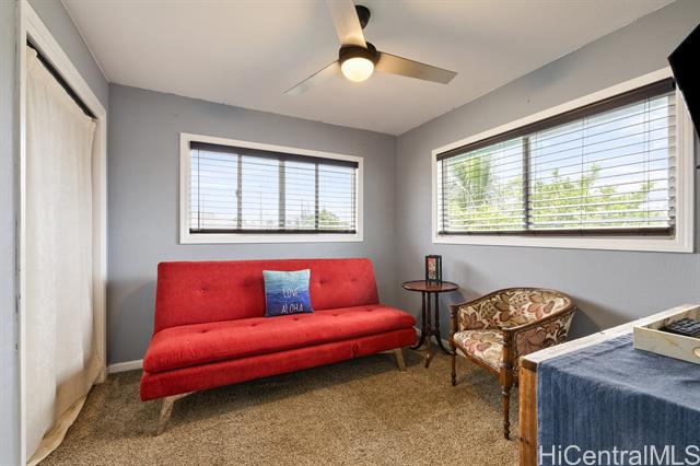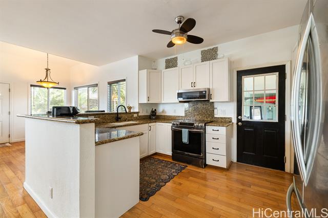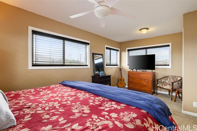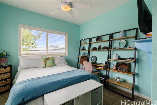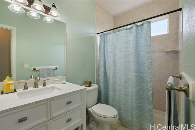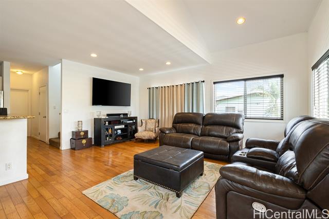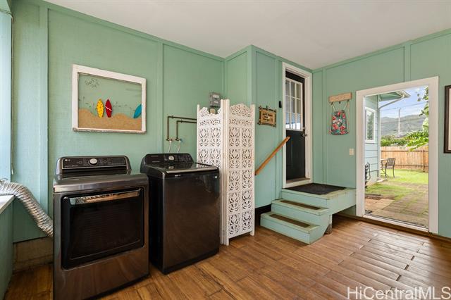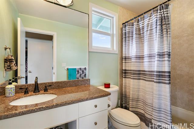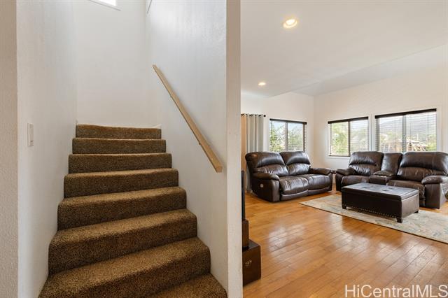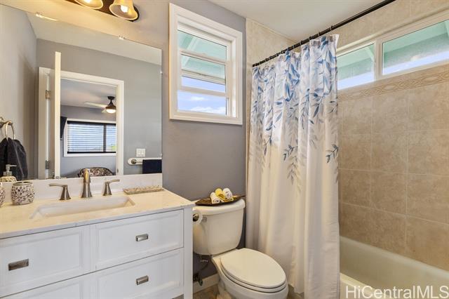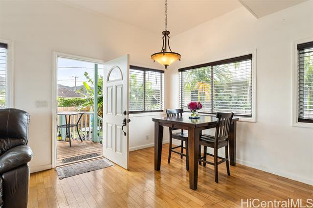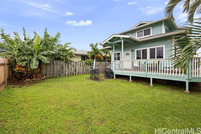 Welcome home to this bright and breezy 3-bedroom, 3-bath residence in the desirable Waiakalua neighborhood of Kaneohe with NO HOA. Abundant windows invite refreshing trade winds and natural light throughout the home, creating comfortable year round island-living. Enjoy a spacious, quiet, fully fenced yard with lush landscaping and a mature Apple Banana tree, perfect for relaxing or entertaining. The open-concept living, dining, and kitchen area features rich hardwood floors, while the kitchen offers granite countertops, ample cabinetry, and generous prep space. A bedroom and full bath on the main level provide ideal flexibility for guests, multi-generational living or home office. Upstairs, the primary suite and guest bedroom each feature private ensuite baths, offering comfort and privacy for all. Enjoy a large two-car garage with parking for 3 more vehicles in the driveway, and a bonus 350+ sq ft covered lanai connecting the garage to the home, perfect for entertaining, workouts, or relaxing outdoor living. Conveniently located near Kaneohe Marine Corps Base, beaches, schools, shopping, dining, and golf courses, this home blends comfort, convenience, and island charm.