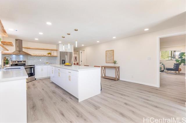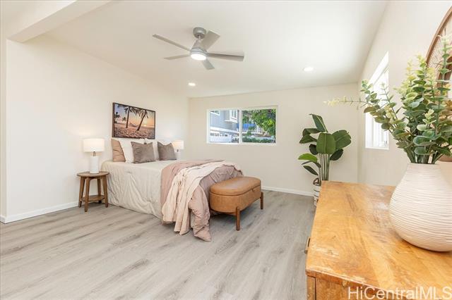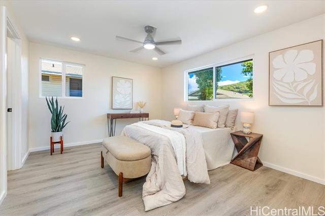 Discover the epitome of extended family living in this beautifully remodeled large home! Featuring an efficient and versatile two-story floor plan, the main level offers 2 bedrooms and 1 bath, complete with a kitchenette and private entrance—perfect for extended Ohana living. The inviting living room flows into an open-concept kitchen and formal dining area, providing easy access to the rear yard for outdoor enjoyment. An interior staircase leads to the upper level, where you'll find 3 additional bedrooms and 2 baths, making this setup ideal for multi-generational living, aging in place, or generating rental income. Every inch of this home has been meticulously upgraded from floor to ceiling, showcasing new windows, doors, flooring, kitchens, and baths, along with modern appliances and updated plumbing and electrical systems. Plus, enjoy peace of mind with a brand-new roof. Relax on the welcoming front covered lanai, or enjoy the front private setting for the gardening enthusiast. Nestled in the desirable Pokai Bay Estates community, you're just moments away from Tamura Super Market, local eateries, shops, and the stunning Pokai Bay Beach, ensuring all your needs are within reach!