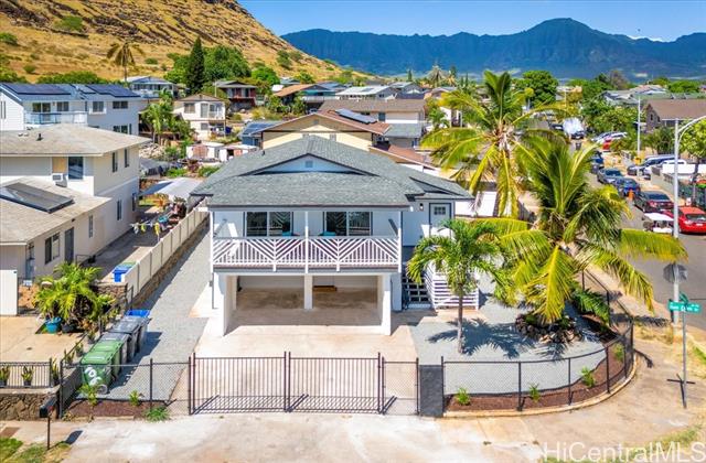Experience the ultimate in extended family living with this beautifully remodeled corner lot home! Boasting an efficient and versatile floor plan, this two-story residence features 3 bedrooms and 2 baths on the main level, complemented by an interior staircase leading to a lower ground level with 2 additional bedrooms, 1 bath, a kitchenette, and a private entrance. This setup is ideal for multi-generational living, aging in place, or even generating rental income. Meticulously upgraded from floor to ceiling, this home showcases new windows, doors, flooring, kitchens, and baths, along with modern appliances, plumbing, electrical systems, and a brand-new roof. Embrace the serene mountain views from the welcoming front lanai or unwind on the expansive covered patio deck. The spacious, fenced-in yard is perfect for children, pets, and outdoor gatherings, while ample parking is provided with a covered carport for 2 vehicles and room for 3-4 more. Nestled in the desirable Pokai Bay Estates community, you'll be just moments away from Tamura Super Market, local eateries, shops, and the beautiful Pokai Bay Beach, ensuring everything you need is within reach!