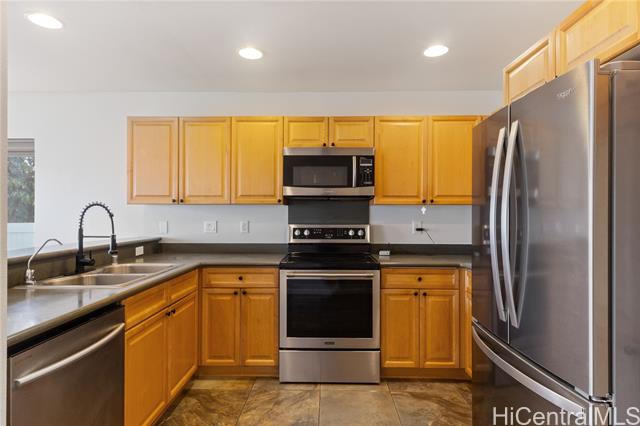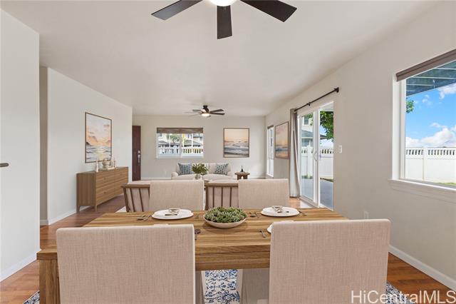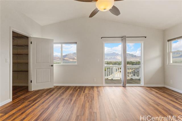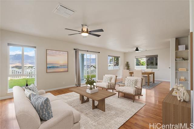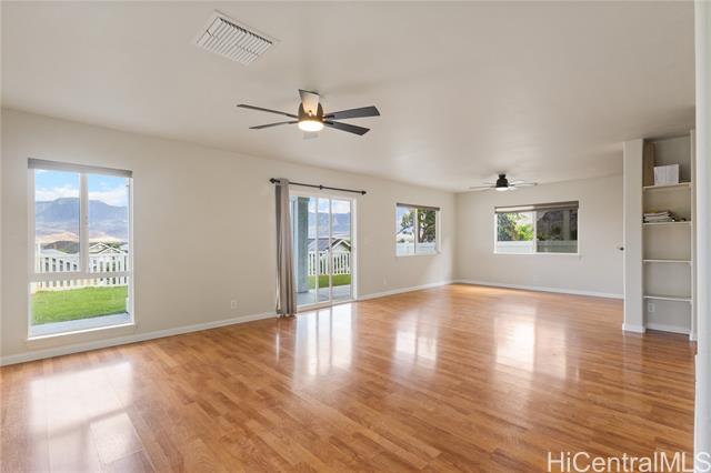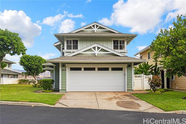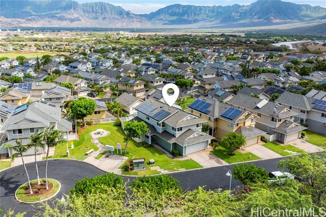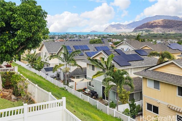 OCEAN VIEWS! Rare, large 5-bedroom, 3 bath 1,871 sq. ft. ocean view home located on a rim lot in Upper Pakeke St with no homes in front and panoramic mountain, ocean and sunset views behind. Built with upgraded DR Horton options including extra-large primary bedroom with walk-in closet, 144 sq ft deck with spectacular mountain, ocean and sunset views, and a covered downstairs patio. New roof installed in 2023, new refrigerator, remodeled custom tile shower, new baseboards, new garage door and motor, freshly painted interior, and exterior was painted in 2023. Central AC and fans throughout the home keep you cool, plus extra savings come from Solar Heater and (leased) Tesla PV System with a coveted HECO NEM (Net Metering) agreement. Serene cul-de-sac location. Sea Country is a lovely community with pool and recreation area, shops, park, and more. Maintenance fee includes front yard landscaping, sewer, water and trash. Near beaches and close to Kapolei, Oahu's "second city." Seller to credit Buyer $1,500 for deck resurfacing.