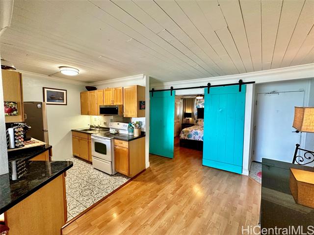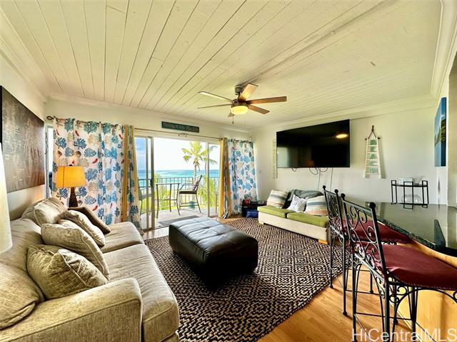 Stunning Oceanfront Condo with Spectacular Views! Charming one-bedroom, one-bathroom condo offers a perfect blend of comfort, convenience, and breathtaking views. Nicely upgraded with wood laminate flooring throughout home with updated kitchen and bathroom, barn doors to bedroom, in-unit washer and dryer provide added convenience for your laundry needs. Located in a well-maintained building with gated entrance, Well-maintained building with attentive management and secure gated entrance. Experience panoramic views of the ocean, majestic mountains, and captivating sunsets from the comfort of your living room and covered lanai. ONE OF THE FEW UNITS IN THIS COMPLEX WITH IT'S OWN WASHER AND DRYER IN UNIT! ONE DEDICATED PARKING STALL AND 7 GUEST PARKING STALLS. CAR WASH AREA ON SITE! SURF BOARD STORAGE AREA ON SITE