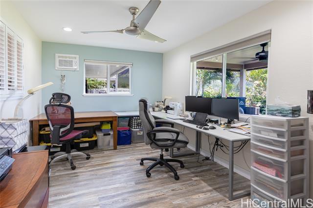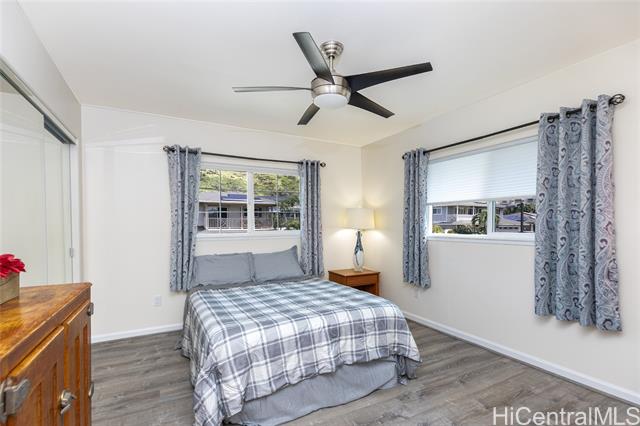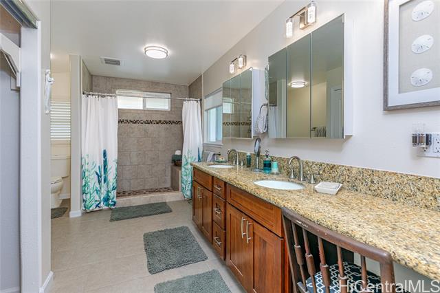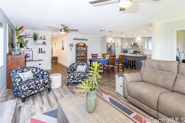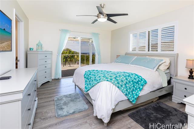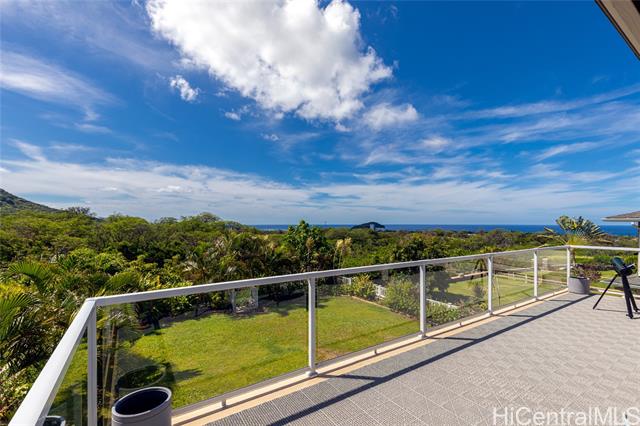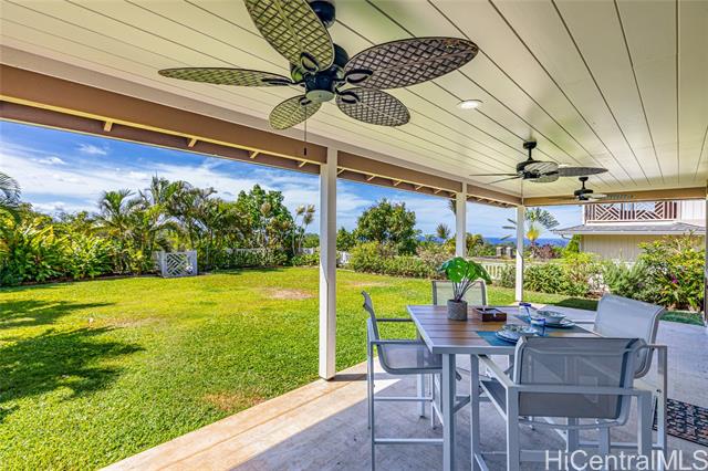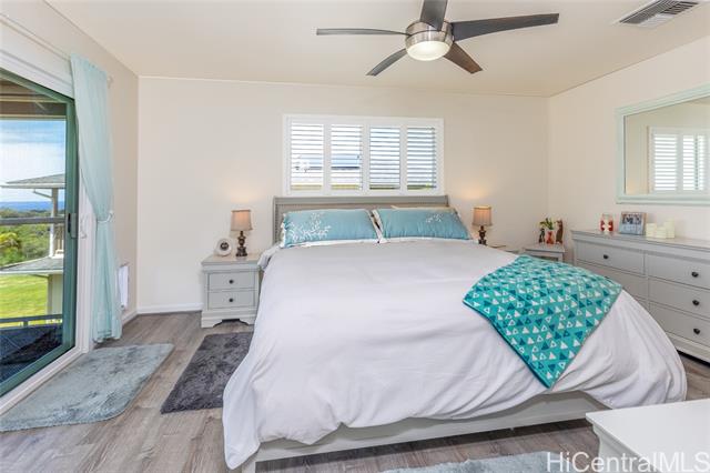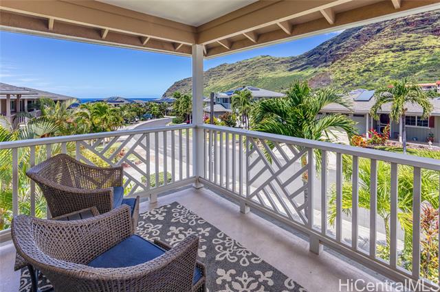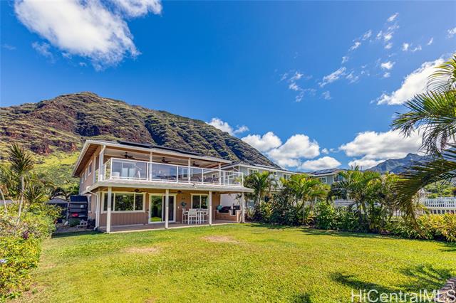 Wake up to sweeping ocean and mountain views from this beautiful home in the gated community of Makaha Oceanview Estates. This well-maintained residence features 3 bedrooms, 2.5 bathrooms, and a versatile office or hobby room on the first floor. The inviting open floor plan is highlighted by a remodeled gourmet kitchen with gas stove that flows seamlessly into the dining and spacious living areas, perfect for entertaining and everyday island living. The primary suite offers a large walk-in closet and direct access to an expansive approximately 600 sq. ft. covered/open lanai, ideal for relaxing while enjoying breathtaking sunsets, ocean views, and cooling trade winds. Additional features include fresh interior paint, a 440 sq. ft. enclosed two-car garage, sprinkler system, solar water heater, and 33 leased photovoltaic panels. The fully fenced backyard includes mature fruit trees such as mango, orange, lemon, and avocado, creating your own private tropical retreat in this pet-friendly gated community.
