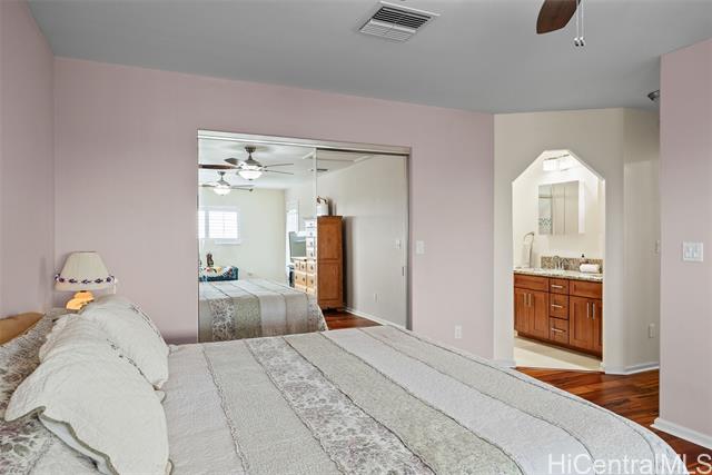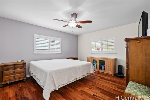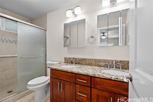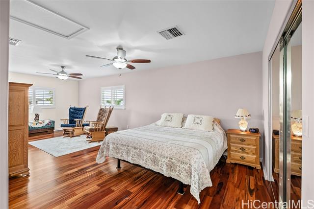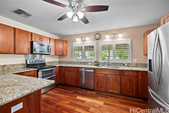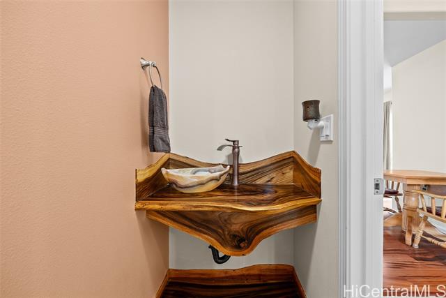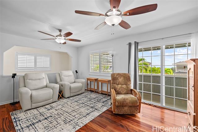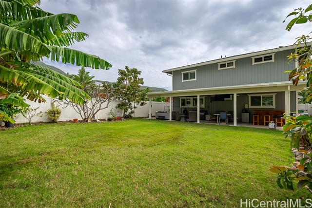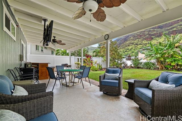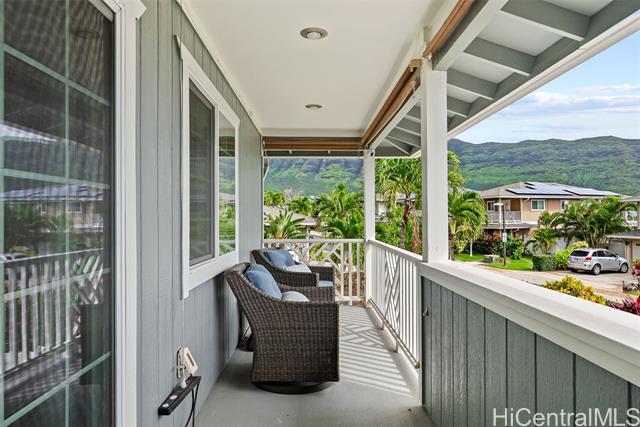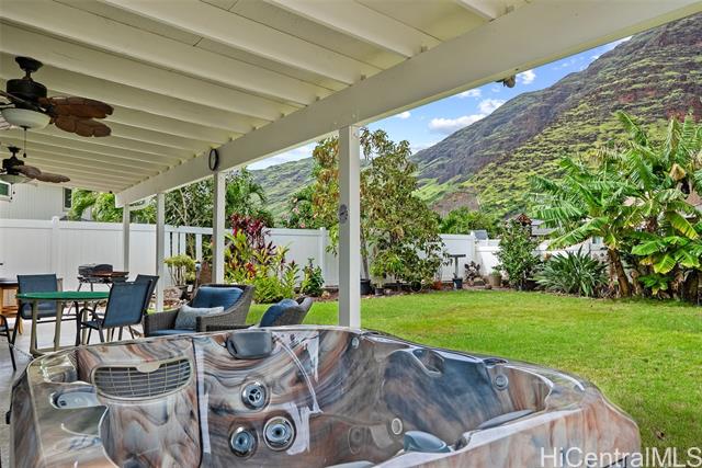 RARE Custom 3 bed 2.5 bath home loaded w/ upgrades in the gated Makaha Oceanview Estates. No side neighbor w/ exquisite ocean & mountain views. Enter through double doors to a travertine foyer & new tigerwood flooring throughout the main living areas. Open concept living & dining flow into a gourmet kitchen w/ granite countertops & stainless steel appliances. Main level features a spacious primary suite w/ ensuite bath & extra large walk in closet. Marble flooring in all bathrooms. The half bath features a custom mango wood vanity w/ onyx sink. Upstairs retreat to a bonus living room w/ lanai & ocean views, plus built in bar/vanity. Custom oversized second primary suite w/ expansive walk in closet & ensuite bath. Third bedroom upstairs w/ mountain views. Landscaped backyard features large covered lanai, new hot tub, bar, water fountain, outdoor shower, fruit trees ( apple banana,orange, avocado), lighting & sprinkler system. Additional features: owned solar panels, new central AC, attic solar fan, plantation shutters, & deep two-car garage w/ laundry. This is a rare opportunity to own a custom, upgraded residence in one of Makaha’s most desirable gated communities.