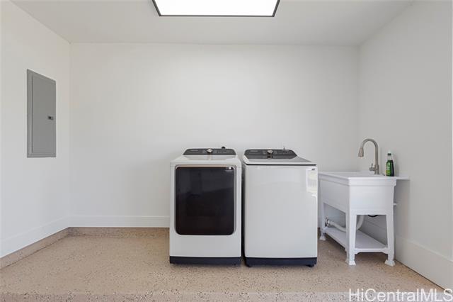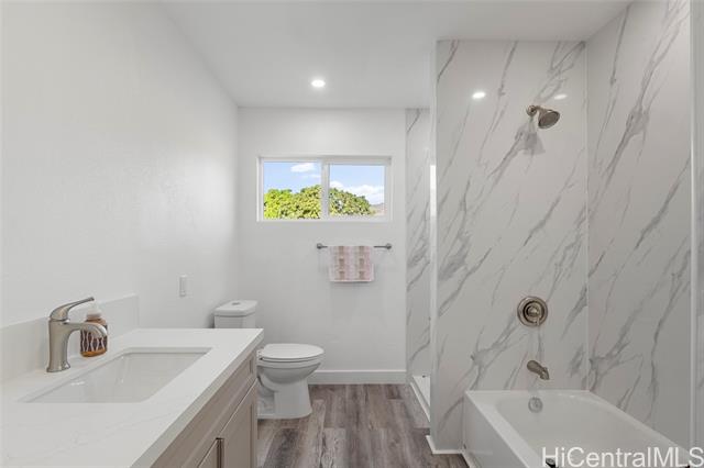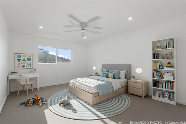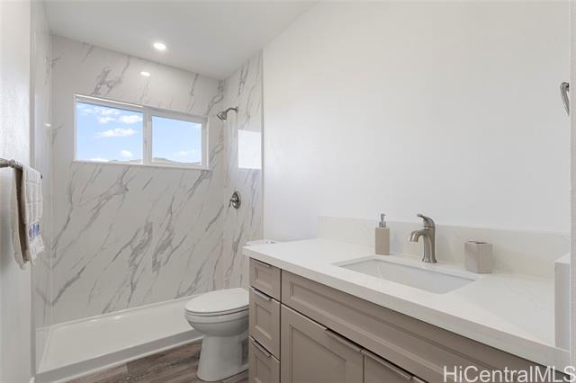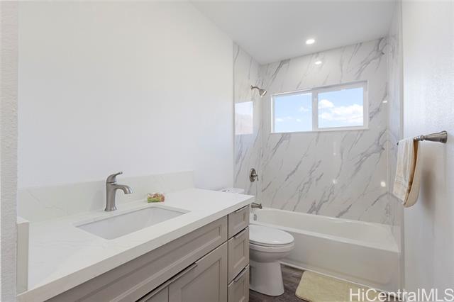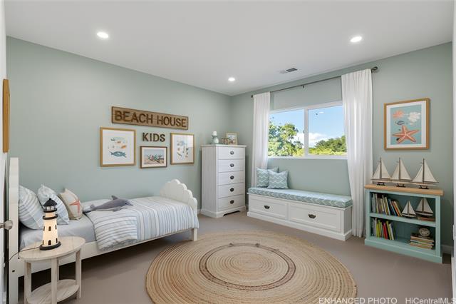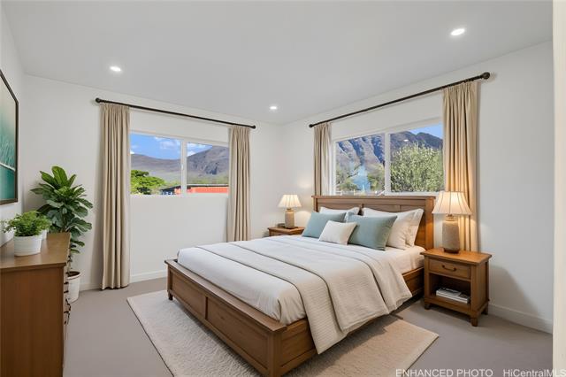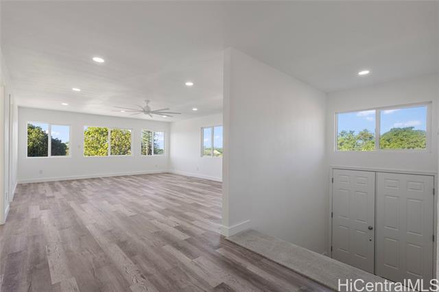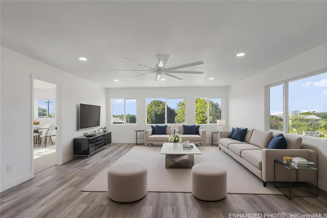Nestled on a 1-acre lot between the mountains and the ocean, this LIKE NEW property offers the best of island living—space, serenity, and stunning natural surroundings. The house has been EXTENSIVELY RENOVATED in 2025 with recessed lighting, double paned windows, vinyl plank flooring, new bathrooms and kitchens w/ stainless steel appliances and quartz countertops! With 3 bedrooms and 2 baths downstairs and 4 bedrooms and 2 baths upstairs, this house offers endless possibilities - rent out one floor and live in the other, multi-generational living, or care home potential. The downstairs and upstairs have 2 separate outdoor entrances, no interior access between floors. Roof was just done in 2024 and has 39 OWNED PV panels on it for a low electric bill. 7 bedrooms total between the 2 floors, tax map records say 8. Bedrooms are spacious and most have mountain views. The upstairs living room has a peek-a-boo ocean view. The generous lot provides endless possibilities, whether you envision lush gardens, outdoor entertaining areas, or room to expand. A rare opportunity to own a slice of paradise where mauka-to-makai views, open space, and nature comes together. Some enhanced photos.
