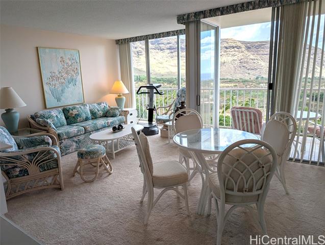 Furnished studio at Makaha Valley Towers. Mountain and coastline views with a lanai. Located on the upper side of the property, away from the main entrance and the central air conditioning building. Twenty-four hour security, a swimming pool, barbecues, community laundry and easy access to the bus line. Maintenance fee includes central air, electricity, hot water, cable tv and internet. Approximately 15 miles to Kapolei, where Costco, Home Depot, restaurants and movie theaters are located.