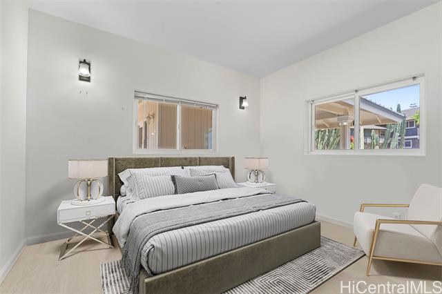 Experience elevated island living in this beautifully designed single-level home in Mauna'olu Estates, a gated community with 24-hour security. Soaring ceilings and expansive glass doors showcase stunning mountain and ocean views while creating seamless indoor-outdoor flow throughout the open-concept living area. The spacious kitchen, anchored by a large island, custom cabinetry, and quality appliances, is perfect for gathering and entertaining. Both the living room and generous primary suite open to a wraparound lanai, ideal for relaxing in the trade winds. The primary retreat features a custom koa wood closet, dual vanities, a jetted tub, and walk-in shower for a spa-like feel. A detached studio with full bath offers flexible space for guests or a home office. Below, a large unfinished area provides room for recreation or future expansion. Complete with 24 owned PV panels, a two-carport, ample driveway parking, and terraced, low-maintenance landscaping, this private hillside oasis blends comfort, sustainability, and breathtaking views.