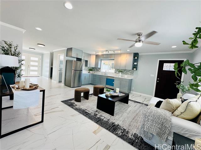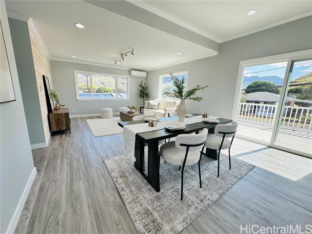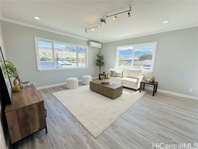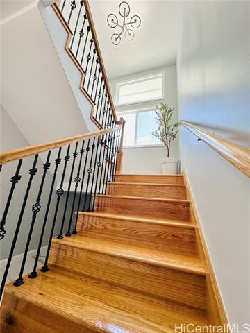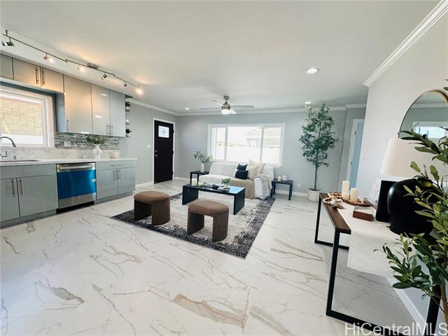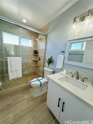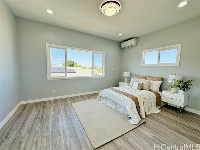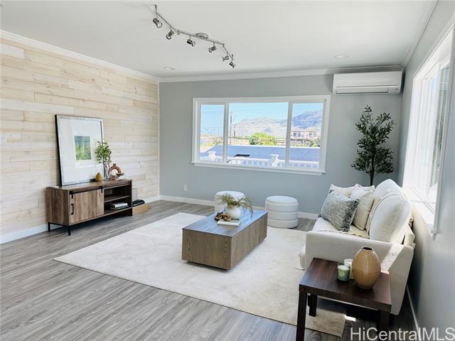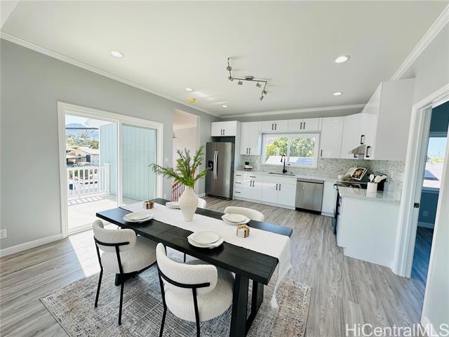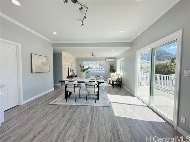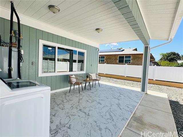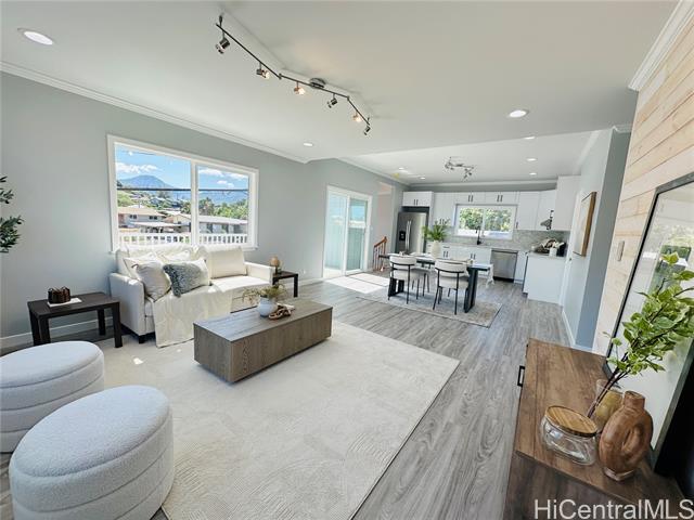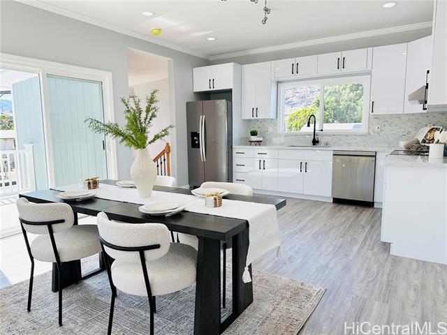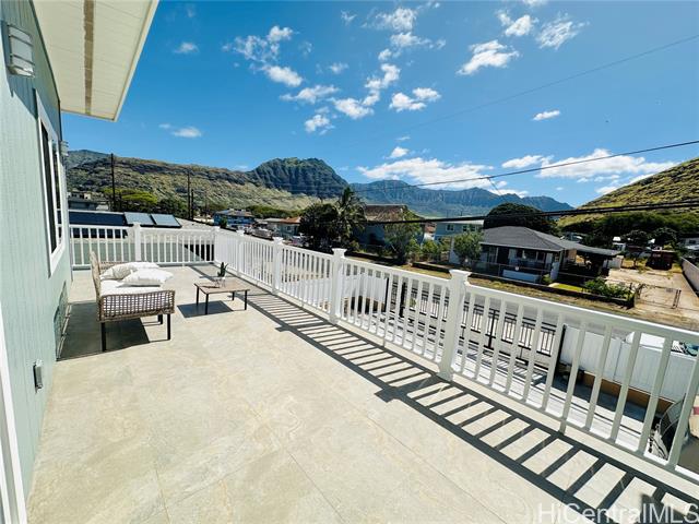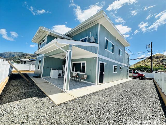 Stunning brand new constructed and beautifully designed contemporary 2-story home featuring 5 bedrooms, 4 bathrooms & 2-car garage with quality materials and finishes. Highlights include porcelain tiles, luxury vinyl plank flooring, recess lights, beautiful kitchen cabinetry & countertops, split AC, and more. Flexible floor plan, great for extended family living. Upper level: 3/2 with full kitchen, dining, living room and a spacious open lanai with stunning mountain views for unwinding after a long day. Lower level: 2/2 with wetbar, family room and a covered patio perfect for the backyard BBQ and entertaining. The open-concept kitchen flows effortlessly into the dining and living areas, creating the perfect space for family gatherings and lasting memories. Large spacious yard for entertaining or gardening. Fully fenced with a motorized gate for privacy. Conveniently located near shopping, schools, and minutes away from Pokai Bay Beach Park. CPR with no common area or HOA fees. Property tax not yet updated. OPEN HOUSE, Oct. 12, 2pm-5pm.