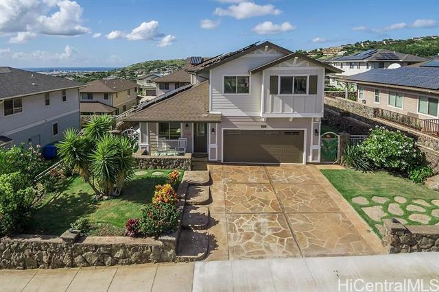 Located in the desirable neighborhood of Kahiwelo, this modern home offers five spacious bedrooms and three full bathrooms—perfect for comfortable island living. Enjoy views of the beautiful ocean and Diamond Head from the living room, dining area, upstairs bedroom, or while relaxing on the outdoor lanai. The first floor showcases oversized marble-style ceramic tile flooring, for a sophisticated feel. The kitchen features upgraded quartz countertops, stainless steel appliances, and an additional island—ideal for both everyday living and entertaining. Stay cool year-round and enjoy the benefit of 27 owned photovoltaic panels—a major cost-saver in Hawaii’s high-energy market. This home is also great for multi-generational living with a bedroom and full bathroom on the main level, and in a great location close to the H1 and "Second City of Oahu" (Kapolei) for your shopping, dining and entertainment needs!
