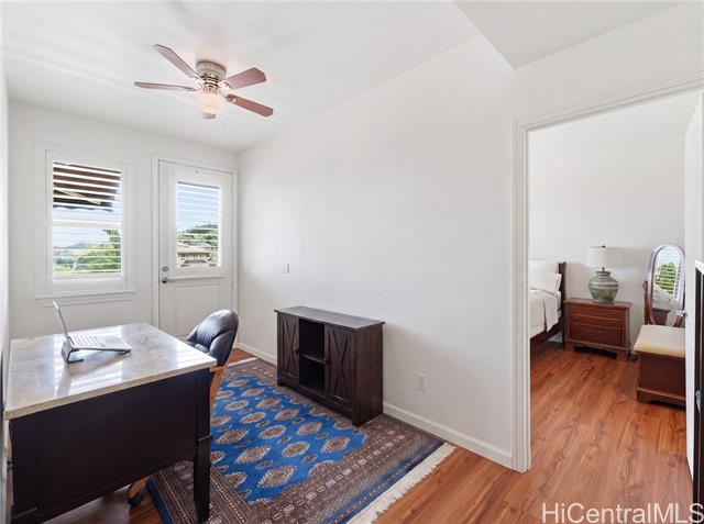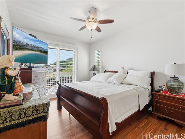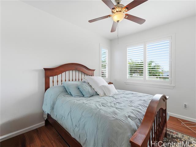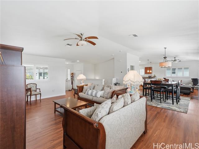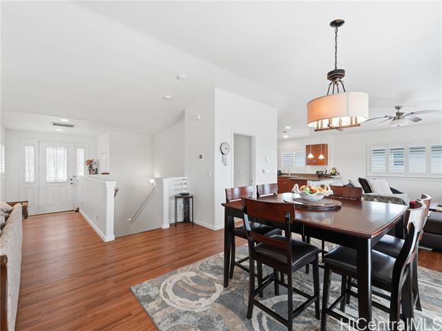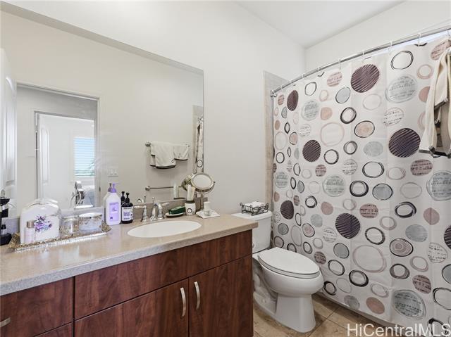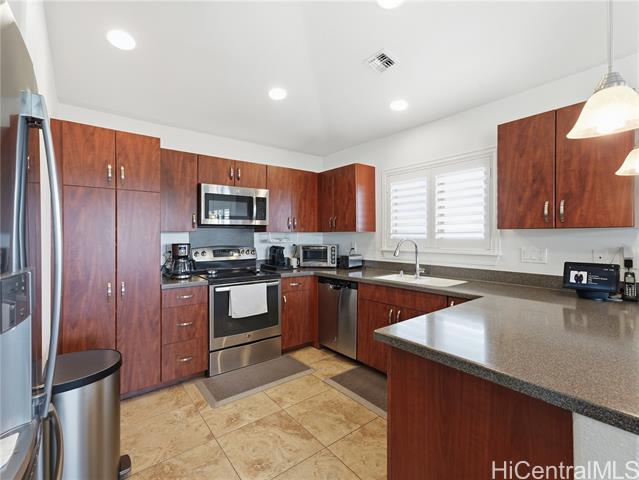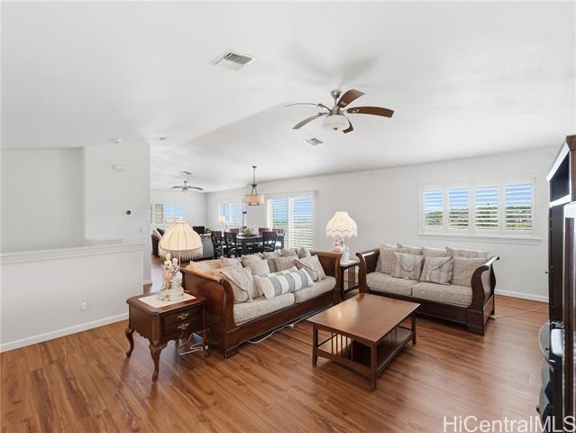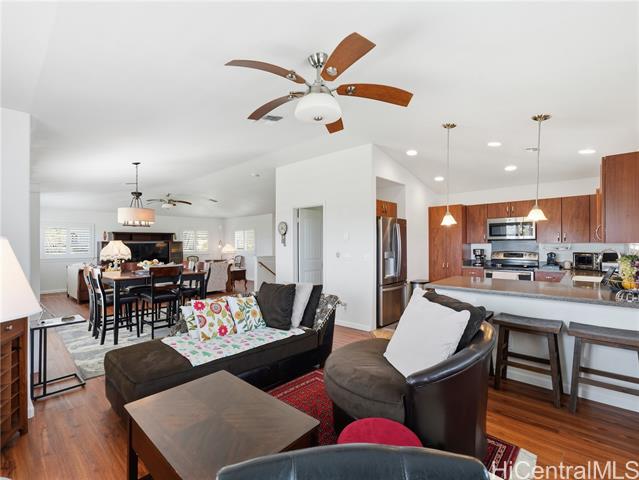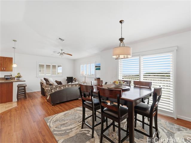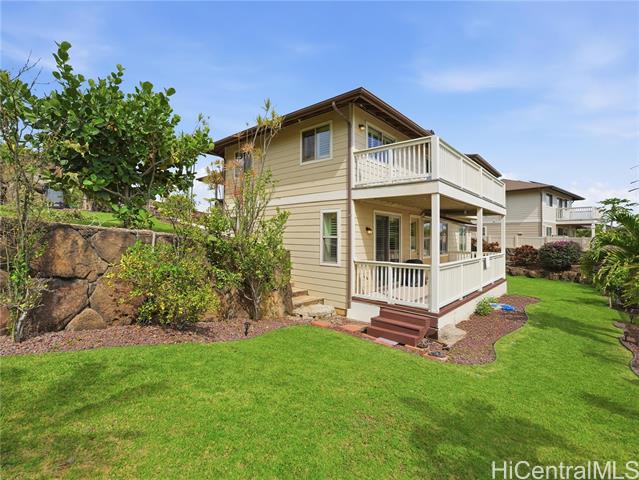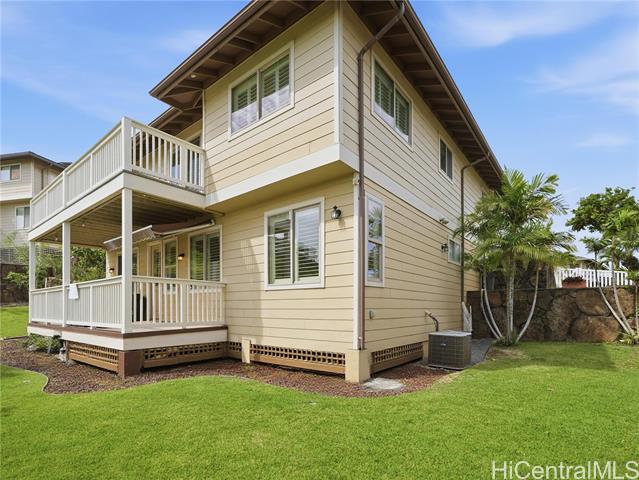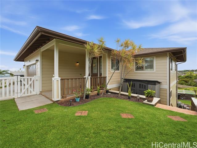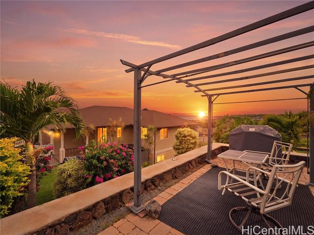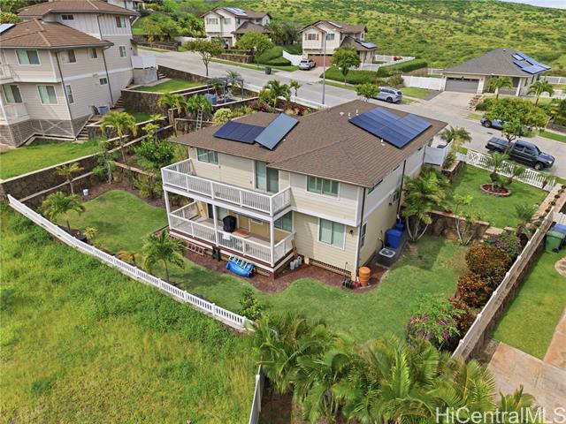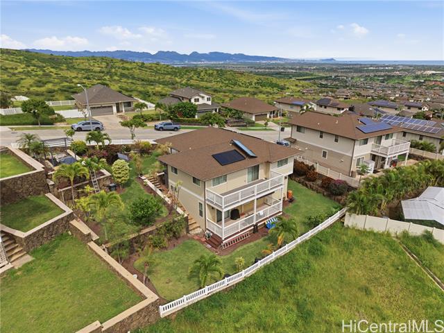 Stay cool year-round and enjoy the benefit of 15 OWNED PHOTOVOLTAIC PANELS, ONE TESLA BATTERY, AND A SOLAR WATER HEATER as a cost-saver in Hawaii’s high-energy market. Located in the Makakilo Kahiwelo neighborhood, this well maintained, move-in-ready home offers 3 spacious bedrooms and 2.5 bathrooms. Overlooking stunning views of Diamond Head, the mountains, ocean, coastline, and spectacular sunrises! The kitchen features quartz countertops, stainless steel appliances, upgraded laminate vinyl floorings, and plantation shutters throughout the house. Relax or entertain your guests in a beautifully landscaped backyard with an assortment fruit trees and plants. Very private with no neighbors blocking the views. A Must See! Close to major shopping centers, Costco, Walmart, Ka Makana Alii and restaurants. Don't miss out on the chance to make this dream home yours! Schedule a showing today.