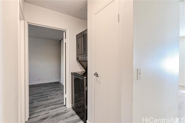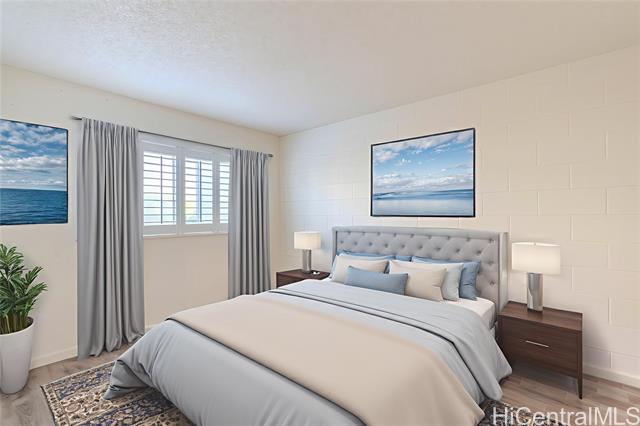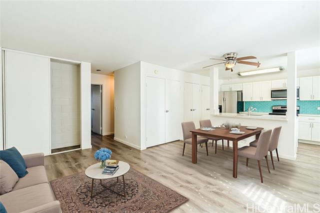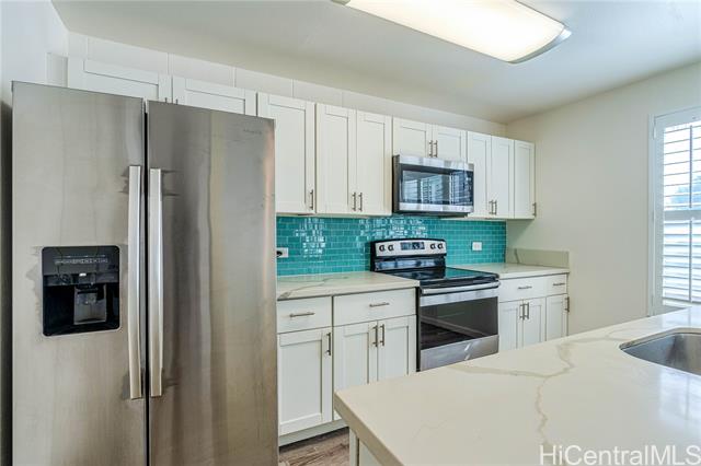 Step into effortless island living with this beautifully remodeled, move-in-ready 2-bedroom ground-floor unit that blends modern style, everyday convenience, and undeniable value—VA approved and complete with a designated parking stall. From the moment you enter, you’ll notice the upscale finishes: brand-new plantation shutters on every window, sleek grey luxury vinyl flooring throughout, and crisp white shaker cabinets with soft-close drawers that elevate the entire space. The stunning kitchen steals the show with quartz countertops, a striking Tiffany Blue backsplash, stainless-steel appliances, and an upgraded laundry center, all designed for both function and flair. Fresh interior paint, contemporary lighting, and a modern bathroom vanity deliver a clean, polished feel, while generous closet and pantry storage keeps everything perfectly organized. Enjoy a partial mountain view and unbeatable proximity to Kapolei, bus lines, shopping, dining, parks, schools, and quick freeway access—this is the rare turnkey opportunity buyers wait for but rarely find. Must see to appreciate