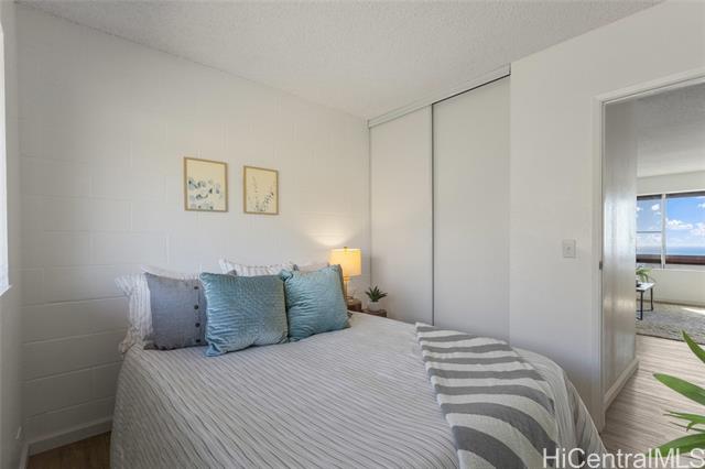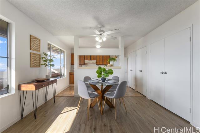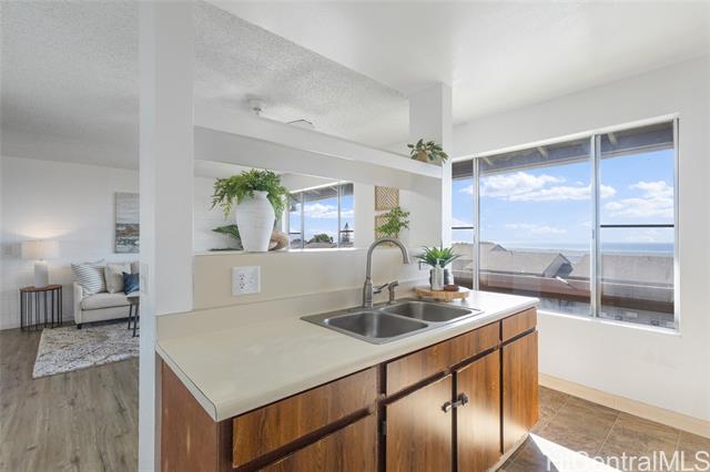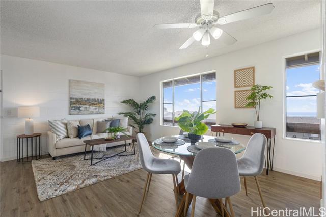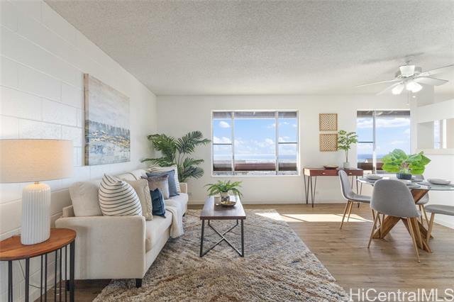 This 3rd-level unit is on the upper terrace, and this unobstructed end unit allows the cool upper makakilo breeze to flow throughout the home. 180 degrees of Spectacular views of Diamond Head through the blue Pacific Ocean of the Leeward Coast. This home features New upgraded flooring throughout the unit. A new water heater, toilet, and mirrored closet doors and tracks in the primary and living room, along with a fresh coat of paint, make this home feel fresh, new, and inviting. Add your own personal design touch to the kitchen and make this home truly yours. Large end parking stall closest to the unit, and 2nd parking is another end stall. Palehua Villas is a pet-friendly complex with a security system throughout the complex. Just off of Makakilo Drive, on major bus lines, and just minutes away from all Kapolei has to offer, Costco, Home Depot, Safeway, restaurants, and entertainment with easy freeway access.
