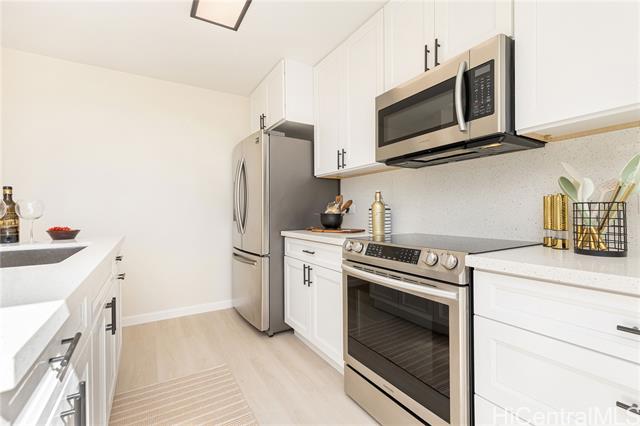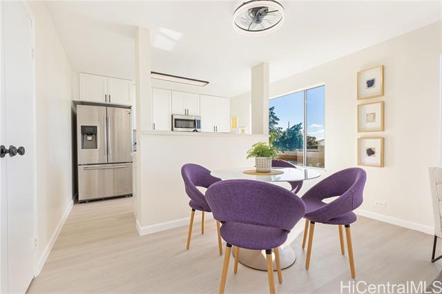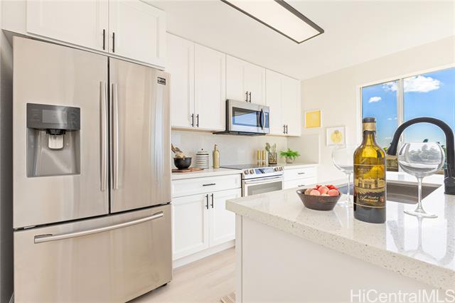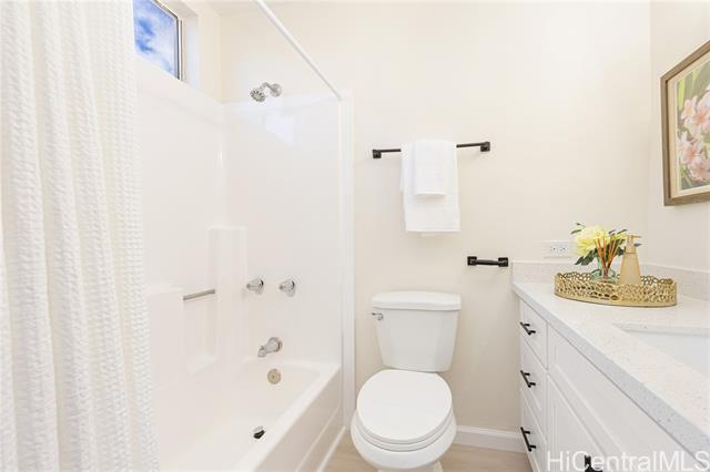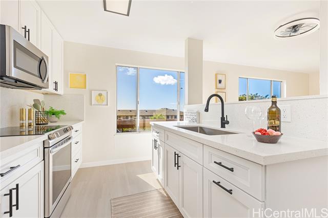 Welcome home to this move-in-ready 3-bedroom, 2-bath townhouse with two parking stalls in breezy Palehua Villas in Makakilo. Enjoy refreshing trade winds and peek-a-boo ocean views from this well-positioned unit, offering both comfort and value. The recently updated kitchen features brand-new quartz countertops, new cabinetry, and stainless steel appliances, creating a clean, modern space perfect for everyday living. Fresh interior paint throughout enhances the home's bright, refreshed feel. Luxury Vinyl Tile plank flooring runs through the main living areas and bedrooms, combining style and durability. A washer and dryer are conveniently located in-unit for added ease. Whether you’re a first-time buyer or investor, you’ll appreciate the cooler hillside climate and peaceful setting. Tucked away for added privacy, yet just minutes from freeway access and all the shopping, dining, schools, and conveniences of Kapolei’s thriving community. Don’t miss this opportunity! Schedule your private showing today.
