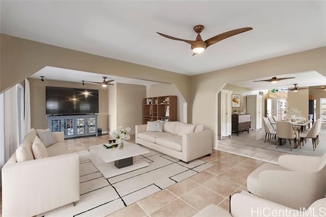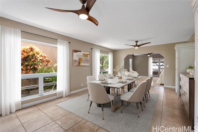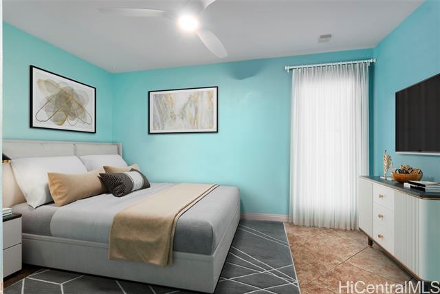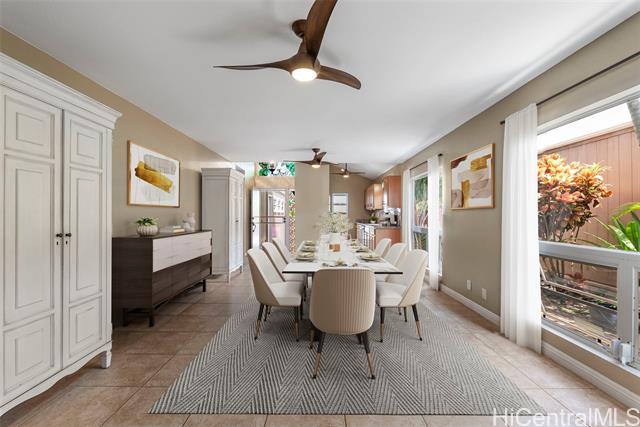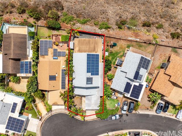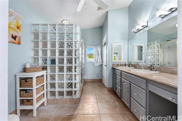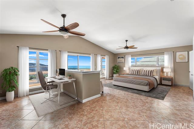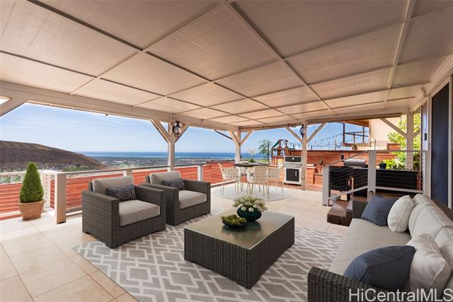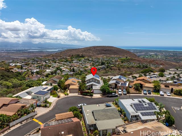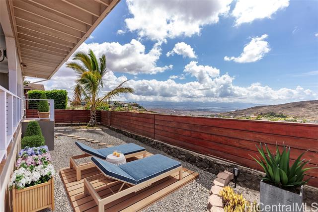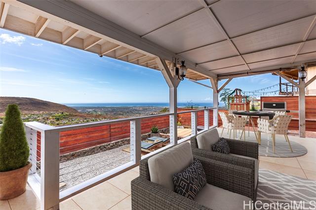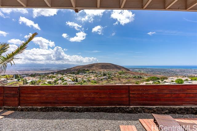 RARE PERIMETER LOT WITH PANORAMIC VIEWS! Perched on the breezy & cool Makakilo hillside, this beautifully renovated 4-bed, 3-bath gem is all about the VIEWS! Wake up to sweeping vistas of the city skyline, mountain ranges, Pearl Harbor, the Ewa/Kapolei plain, & endless ocean blues. This home features a modern kitchen, upgraded windows & flooring, & an expansive covered lanai that truly sets it apart. Whether you're enjoying morning coffee, hosting weekend BBQs, working outdoors, or simply relaxing in your jacuzzi, this lanai is the ultimate indoor-outdoor retreat. Elevated & open to the views, it’s your front-row seat to island living at its best. The thoughtful layout includes 3 bedrooms & 2 full baths on the main level—one of which is a primary suite—providing ideal flexibility for multi-generational living, or guests. Upstairs is dedicated to an oversized GRAND SUITE, offering privacy & comfort. Additional highlights include a spacious 2-car garage, driveway parking, a fully fenced yard for pets or play, 23 leased PV panels & 2 batteries to help keep energy costs down year-round. This is more than a home—it's a front-row seat to Hawai‘i’s natural beauty & lifestyle.