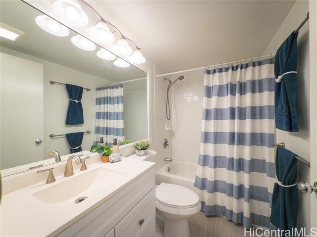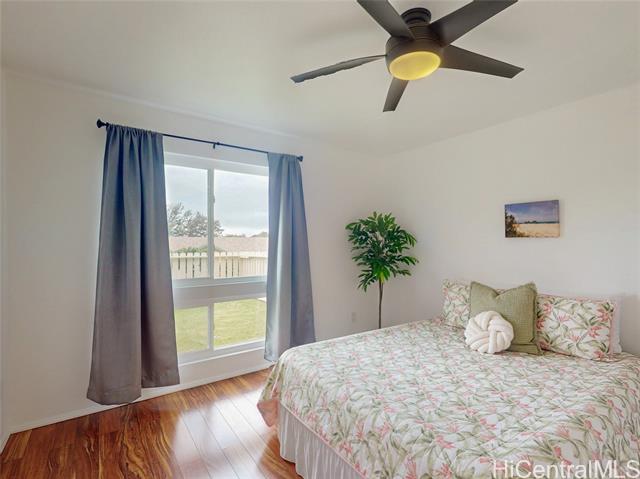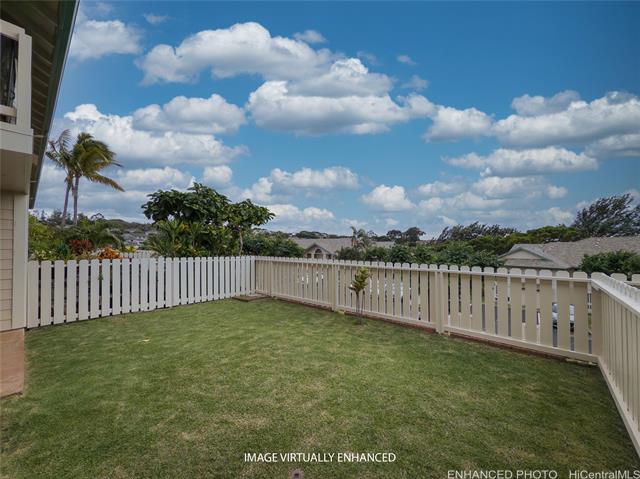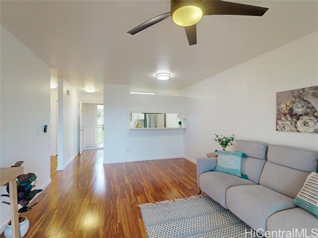 Desirable GROUND FLOOR townhome in Westview at Makakilo Heights! This cool 2-bedroom, 2-bath, 2-parking renovated unit is ready for immediate occupancy. Recent upgrades include new double-pane windows and sliding door and a newly added A/C in the living room, and 2nd bedroom for year-round comfort. The refreshed interior features newer, stainless steel kitchen appliances, elegant quartz countertops, refinished cabinets, and laminate flooring throughout. Bathrooms have been tastefully updated with new vanities, lighting, and ceramic tile flooring and barn door in master bathroom. Enjoy the convenience of a full-size washer and dryer in the unit. Step outside to your own private fenced yard, perfect for entertaining, children and pets. Includes 2 assigned parking stalls, with guest parking available. A must-see opportunity, move-in ready and beautifully updated! Note: One or more photos may have been enhanced.