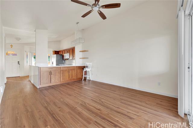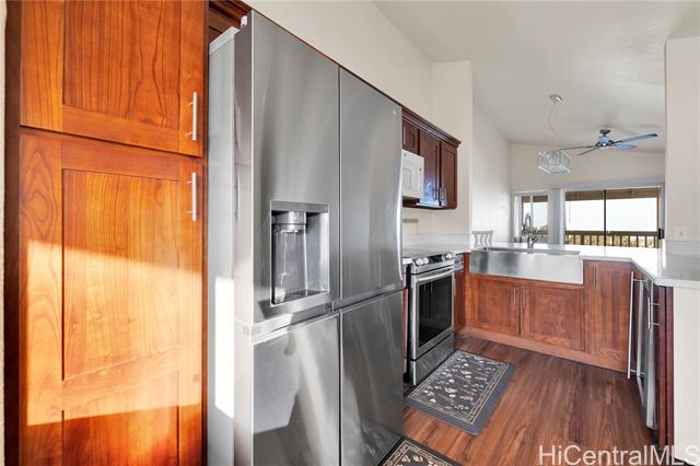 Discover this completely and tastefully remodeled upstairs unit in Westview at Makakilo Heights. This spacious 2-bedroom, 2-bath condo features an open floorplan that extends to a covered lanai with dramatic, azure ocean views. Situated on breezy Makakilo, the unit boasts soaring ceilings and high-end, wood like flooring, perfect for keeping cool and easy cleanup after a day at the nearby beaches. The kitchen is fully equipped for entertaining, highlighted by a built in wine refrigerator. This stunning unit is proudly represented, and pets are welcome.