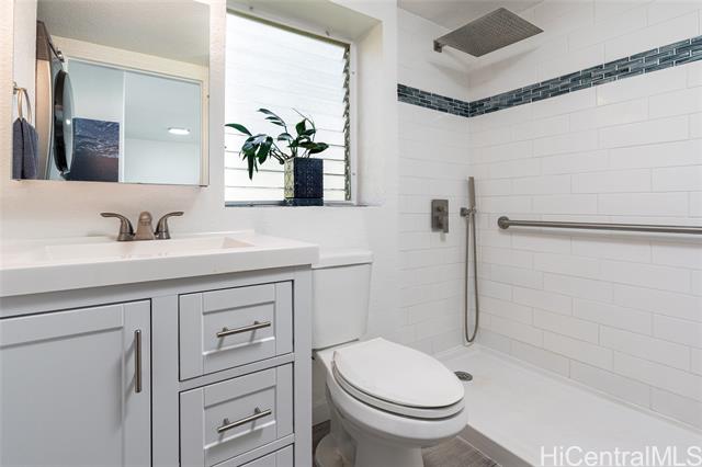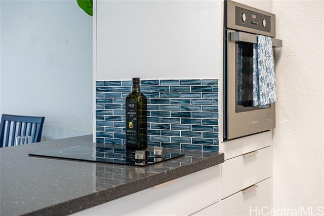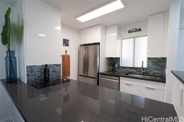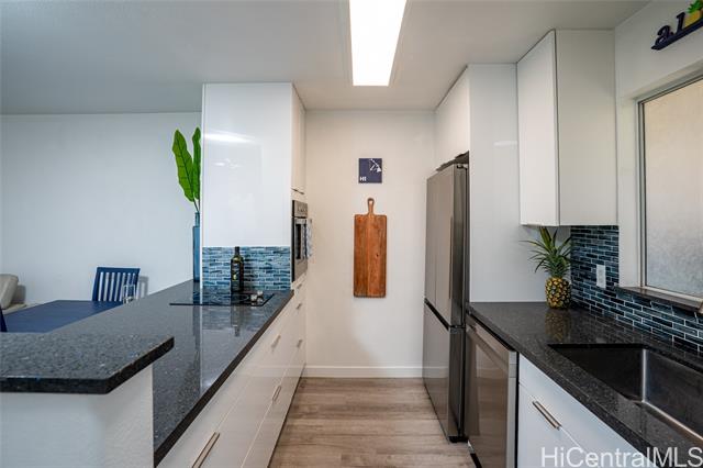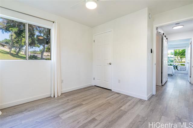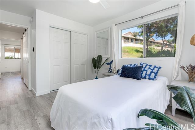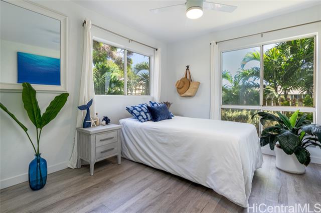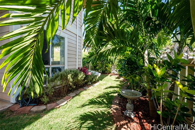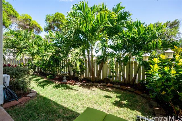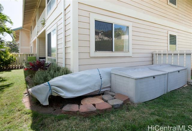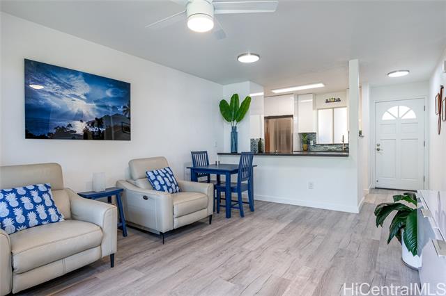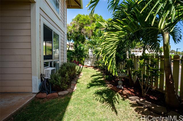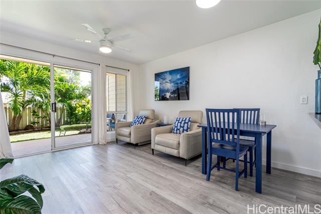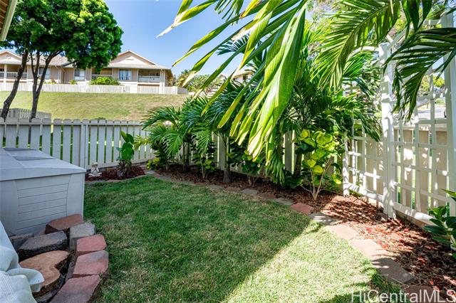 Love of ownership shines throughout this exquisitely maintained and recently remodeled ground-level corner residence. Bathed in natural light and cooled by refreshing island breezes, the home offers 2 spacious bedrooms and 1 beautifully appointed bathroom with walk-in shower. The elegant kitchen features sleek quartz countertops, updated cabinetry, a built-in cooktop and oven, and dishwasher—perfectly blending style and function. Luxury vinyl flooring flows seamlessly throughout, complemented by window A/C, in-unit washer and dryer, and the convenience of two assigned parking stalls located just steps from the entrance. Outdoors, a wrap-around, fully fenced private yard creates a serene retreat ideal for entertaining, simply relaxing with the Makakilo breezes, or a great spot to play with your pet. The backyard also offers a covered lanai perfect for enjoying your favorite morning beverage or beautiful sunsets as the sky glows over the coastline. This exceptional corner unit offers an effortless blend of comfort, elegance, and island lifestyle with easy access to Makakilo Heights Neighborhood Park uphill and H-1 freeway connections and Kapolei Market.