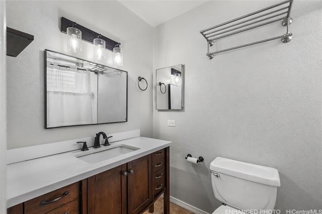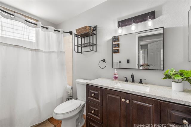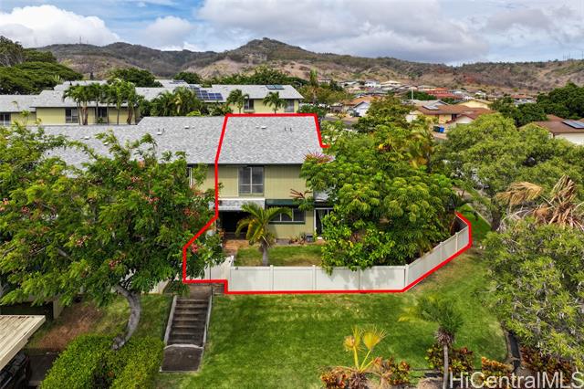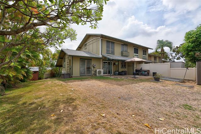 Rare opportunity for peaceful, private corner-lot living with a remarkably large fenced outdoor space, one of Palehua Hillside’s largest yards. This spacious multi-level townhome offers the comfort & feel of a single-family residence w/split A/C, 2 cov’d side-by-side parking stalls, plus ample street parking for guests. Vaulted ceilings & an open, airy layout enhance the sense of space, while the wrap-around, fully fenced private yard creates an exceptional setting for indoor-outdoor island living. Enjoy morning coffee on the lanai, evening gatherings under the stars, and plenty of room for pets to play in a tranquil, tropical environment. First level features a versatile living room with double-door entry. Updated for modern living, the bright open kitchen features an island, granite countertops, stainless steel appliances & flows seamlessly into the dining area. The main living level also includes a convenient half bath w/indoor laundry, side-by-side full-size W/D. The primary suite offers a walk-in closet w/built-in shelving and en suite bath, creating a comfortable private retreat. Enjoy ceiling fans, vinyl plank flooring, 2-outdoor storage sheds & pet-friendly community!