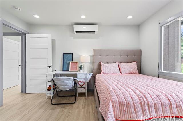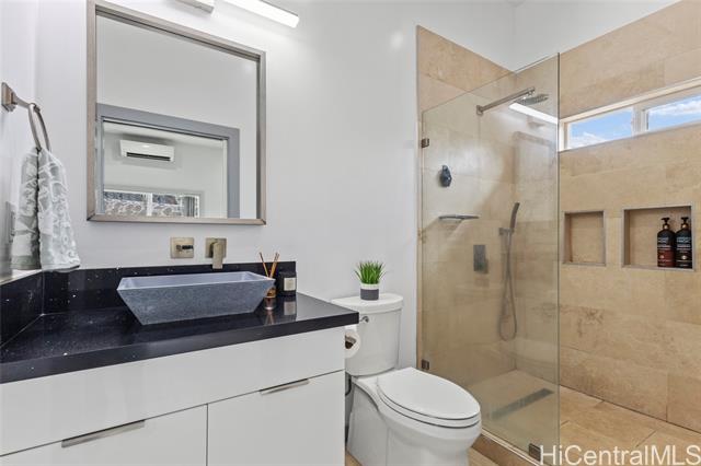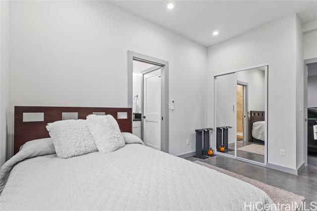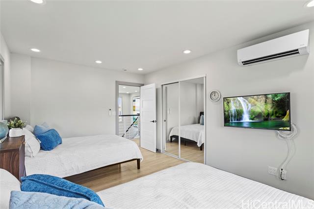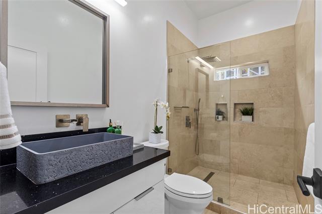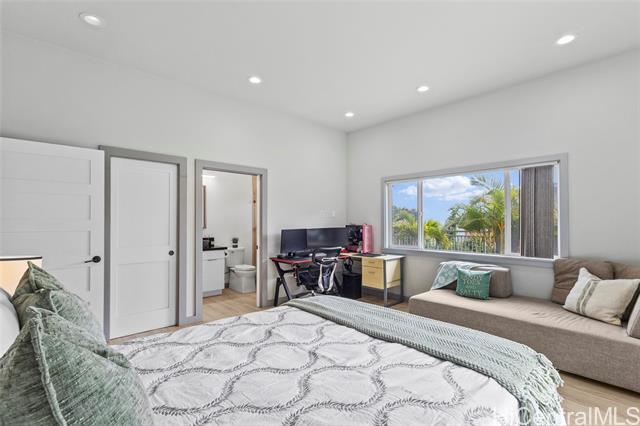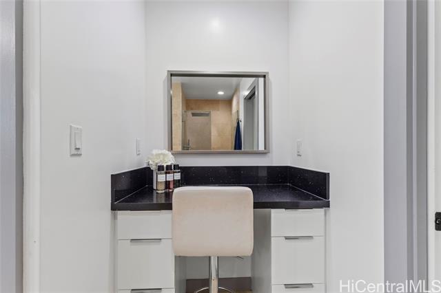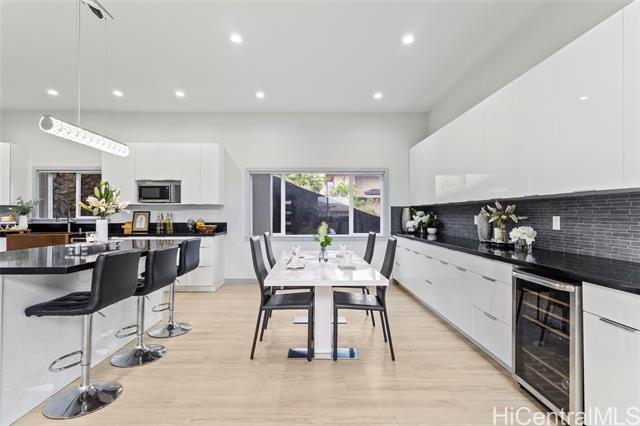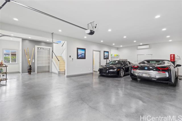 Perched on a perimeter lot in Wai Kaloi at Makakilo, this custom-built 2021 estate blends refined luxury with thoughtful design. Featuring 6 bedrooms and 5 full baths—including two junior suites with en suite bathrooms—this home is ideal for multigenerational living. Soaring ceilings and expansive windows bathe the interiors in natural light, while AC throughout, a central vacuum system, and luxury vinyl plank flooring throughout provide effortless comfort. The gourmet kitchen is beautifully appointed with quartz countertops and a statement copper sink, plus a separate wet bar with its own copper sink for elevated entertaining. The primary suite is complete with its own balcony capturing sweeping East Honolulu views, an expansive walk-in closet, and a spa-inspired bath with rainfall shower, jet tub, dual vanities, and a dedicated cosmetic vanity. A motorized entry gate enhances privacy, while an elevator, 4-car garage with EV chargers, lush tropical landscaping, and generous outdoor space for gatherings or additional parking complete this island sanctuary. Seller has approved permits to expand the interior living sq ft and construct a new garage, offering future growth.