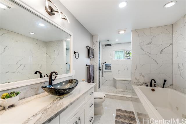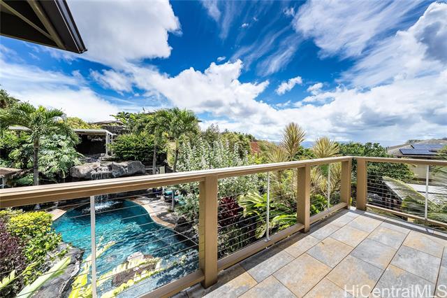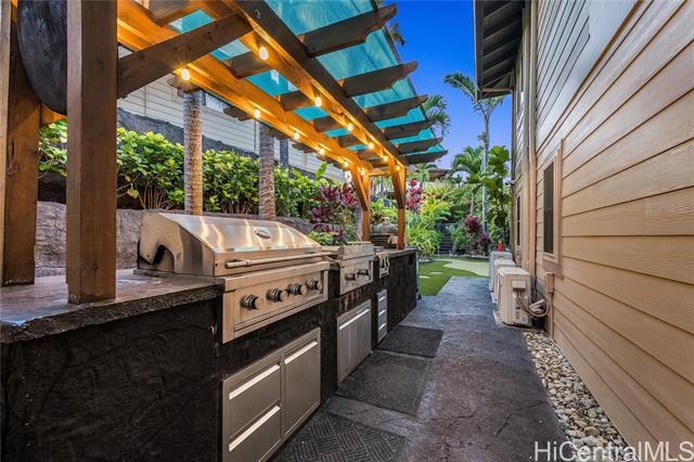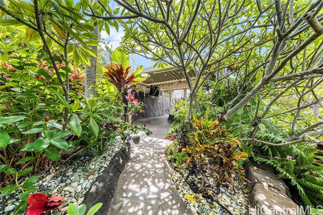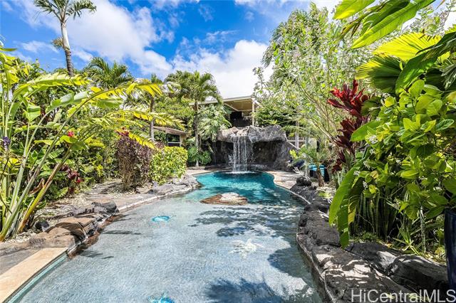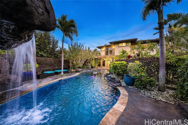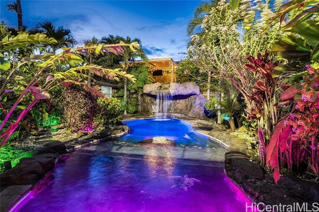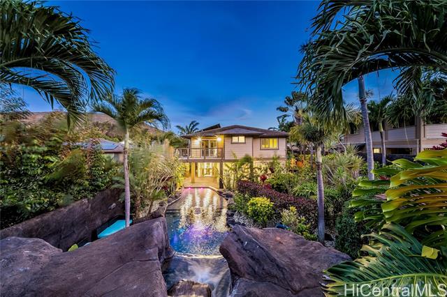 Welcome home to Paradise in Paradise! Resort-style living for your exclusive use. Enjoy an outdoor oasis customized by pool designer for high-end hotels and luxury high-rises...all to yourself. This 5 bedroom executive home features a large pool with wading-area and waterfall, hot-tub with trellis and outdoor TV. No expense was spared in upgrading this home. Spectacularly landscaped yard and terrace features fruiting plants, sprinkler systems, accent lighting and your own putting-green. Incredible outdoor kitchen with grills, griddle, burners, Big Green Egg and smoker plus a bar complete with self-pour tap wall. This property boasts a range of luxurious amenities including plantation shutters, 21 owned PV panels, top-of-the-line KitchenAid suite, split AC throughout, LVP flooring and stain blocking carpeting. Covered lanai just outside of the dining room adds to your indoor/outdoor enjoyment as does the wrap around 2nd floor lanai. Primary bedroom features a massive walk-in closet and an incredible bathroom with deep soaking jetted tub and multiple shower heads. All this just minutes away from fantastic dining, shopping and entertainment. This home is truly one of a kind.