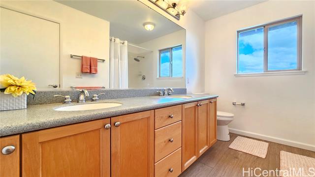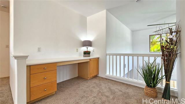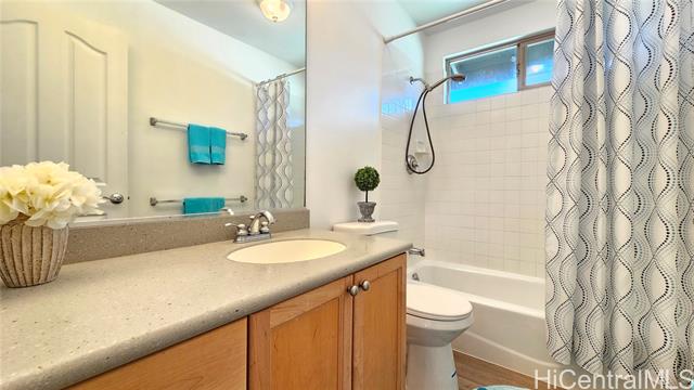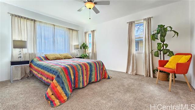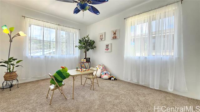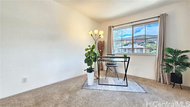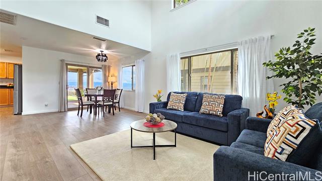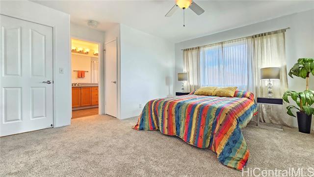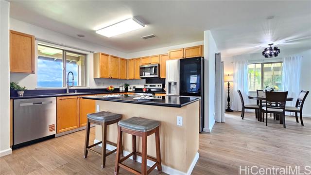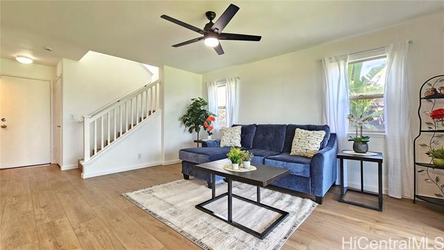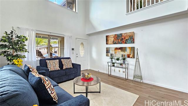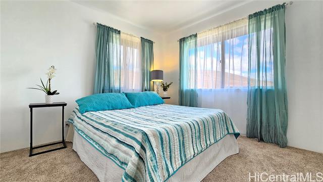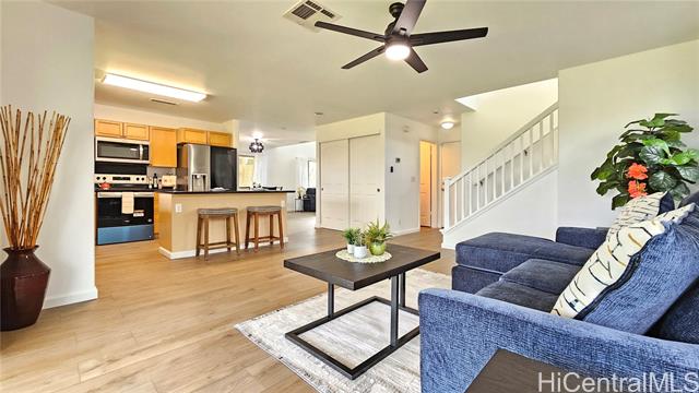 Experience elevated island living in this stunning Wai Kaloi residence, perfectly positioned at the serene edge of Makakilo. This beautifully maintained 4-bed, 2.5-bath home features high ceilings, abundant natural light, and a functional layout. Enjoy luxury vinyl flooring downstairs, plush carpet upstairs, and freshly painted interiors. The kitchen boasts Corian counters, a center island, and all-new stainless steel appliances, flowing seamlessly into spacious dining and living areas — ideal for entertaining. Step out to a covered lanai with mountain and Honolulu views and no rear neighbors for added privacy. The landscaped backyard includes mature tropical plants like Bird of Paradise, Heliconia, and Plumeria, plus an automatic sprinkler system. Located near schools, shopping, dining, and theaters — a peaceful retreat in Oahu’s growing “Second City.” This home must be seen to truly appreciate all it has to offer.