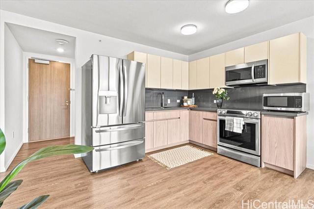 Welcome home to Symphony Honolulu! Fully renovated 1 bedroom, 1 bath unit with an assigned parking stall. This remodeled unit features new luxury vinyl plank flooring, modern counter cabinet, updated modern light fixtures, and freshly paint throughout. Prime location in the heart of the city offers easy access to Ala Moana Shopping Center, beaches, entertainment, and public transportation. Pet-friendly, secure building with a resident manager on property. Maintenance fee covers internet, water, sewer, and cable TV, so you can enjoy living.