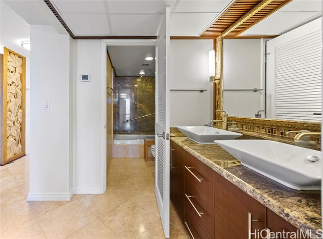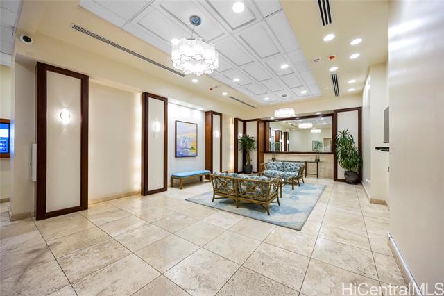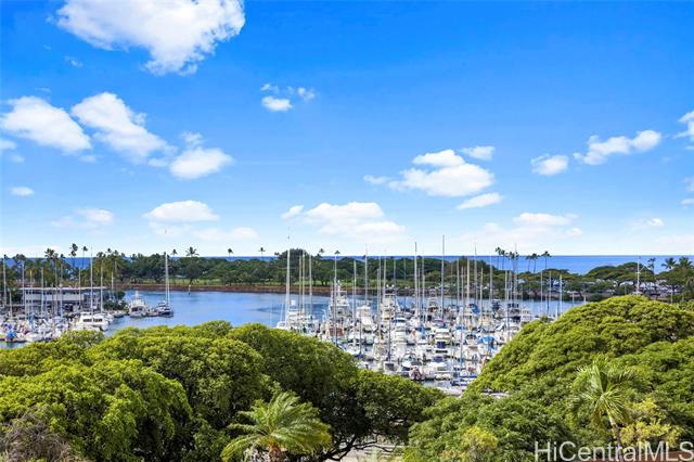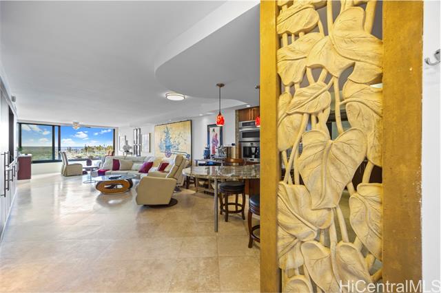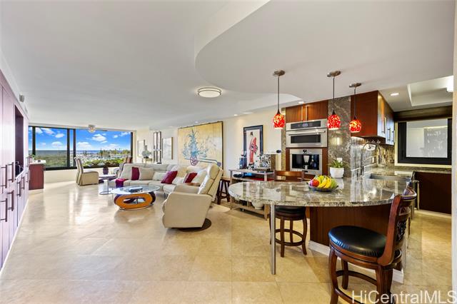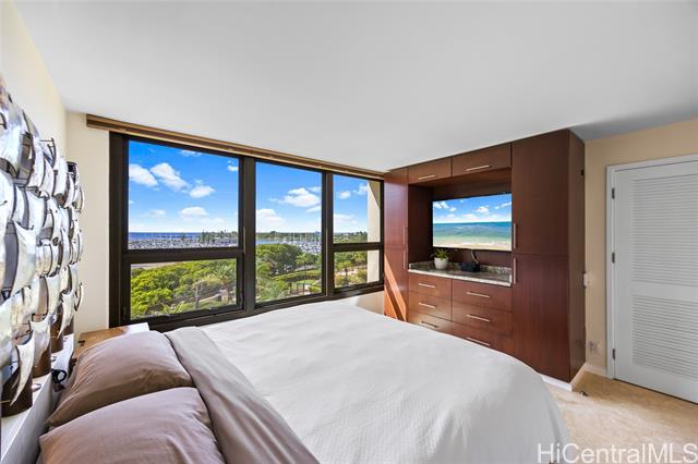 Enjoy ocean, marina, and sunset views from this stunning and sophisticated apartment home. One of the larger one-bedroom floor plans in the building, the unit offers a bright open living area designed to maximize light and views. Thoughtfully and luxuriously renovated with quality materials and custom built-ins, the residence features travertine floors, warm wood cabinetry, and a fully equipped kitchen seamlessly integrated into the living space. The bedroom offers generous storage and is a peaceful retreat with large windows framing lush greenery and city views. Located at the gateway to Waikiki, just moments from Ala Moana Shopping Center, beach, and park, this well-maintained residence provides a comfortable and convenient island lifestyle. In the quiet Diamond Head tower of the complex, the apartment offers easy access to an array of amenities including swimming pool, whirlpool spa, barbeque/recreation area, and tennis court. An assigned and secure parking stall is close to the lobby entrance. Elegant furnishings are available.