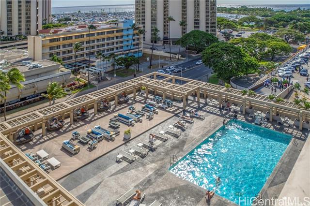 Highly Desirable unit in the sought after Partial Ocean View Category with less rental competition. Overlooking newly renovated pool. Must see! Grandfathered Short Term Rental: Self-Manage/Hire Onsite Property MGR or 3rd Party Property MGR. MUST SEE! Elegant island-style hotel condo, just steps away from Ala Moana Center and Ala Moana Beach Park. Turn key vacation rental. Maintenance Fee includes internet, cable TV, electricity, A/C, and water.