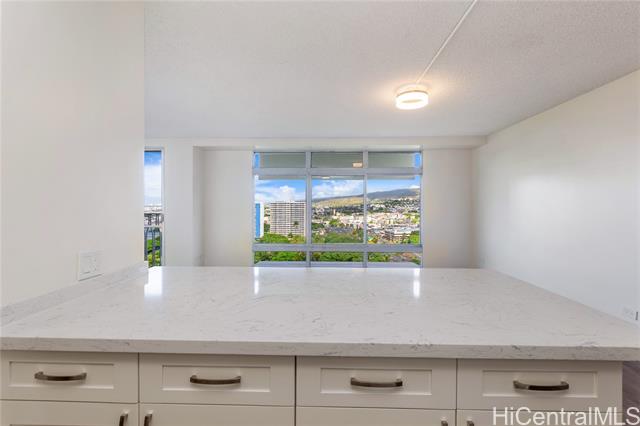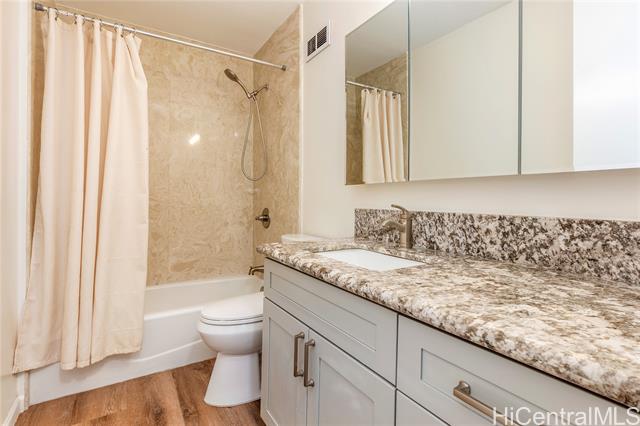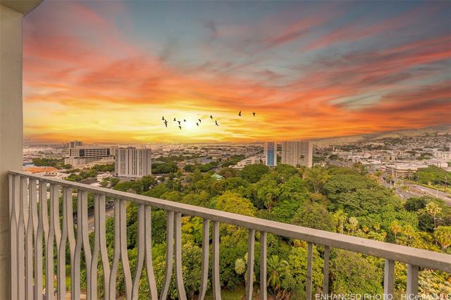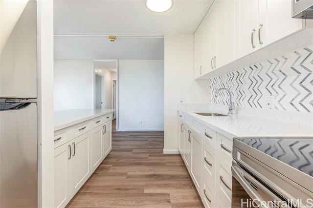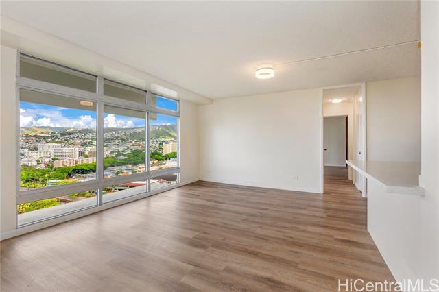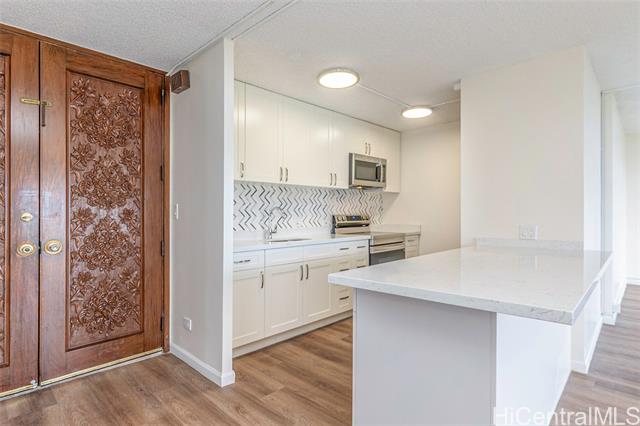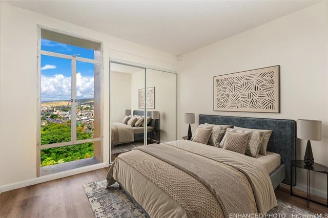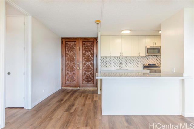 Don’t miss this rarely available corner end unit in the Queen Tower at Queen Emma Gardens. This spacious 2 bedroom, 1 bathroom home with 1 covered parking stall has been beautifully renovated with a modern kitchen featuring stainless steel appliances, quartz countertops, new cabinets, and a stylish backsplash. Laminate wood flooring flows throughout the unit, adding a clean and contemporary feel. Adding to its unique appeal, this was historically the one-of-a-kind unit where the original developer and resident manager resided, featuring ornate double doors that set it apart. Take in the beautiful 20th floor city and mountain views overlooking Foster Botanical Gardens. Queen Emma Gardens is a pet-friendly community offering wonderful amenities, including Japanese-style tea-houses, swimming and wading pools, a tranquil koi pond, BBQ area, and picnic sites, all in a convenient location near downtown Honolulu, shopping, and dining. Put this on your must-see list! One or more photos have been enhanced.