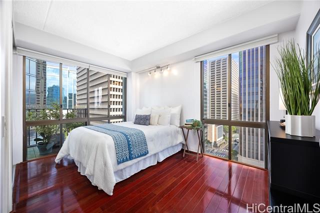 Welcome to Harbor Square, in the heart of downtown Honolulu. This 2-bedroom, 2-bathroom corner unit is situated in the Town Tower, on the cool side of the building, and features a spacious lanai with city & ocean views. The interior features floor-to-ceiling windows, beautiful wood flooring, and a kitchen equipped with modern appliances. Both bedrooms enjoy ensuite bathrooms for added comfort and privacy, and there is ample storage with extra in-unit closet space and an additional storage locker. A great benefit of this property is the all-inclusive maintenance fee, which covers central A/C, water, electricity, cable, and high-speed internet. The secure building features 24-hour security and excellent amenities, including a recently renovated pool and modernized BBQ deck. Ideally located, you are just minutes from Kakaako, Aloha Tower, Queen's Medical Center, State Capitol, Prince Kuhio Federal Building, and top universities, with easy access to H-1 and Nimitz Highway. Although parking is not assigned, stalls are available for rent within the building. This is an excellent opportunity for convenient, high-quality living in Metro Honolulu.