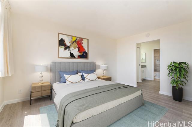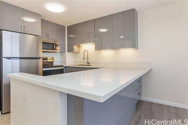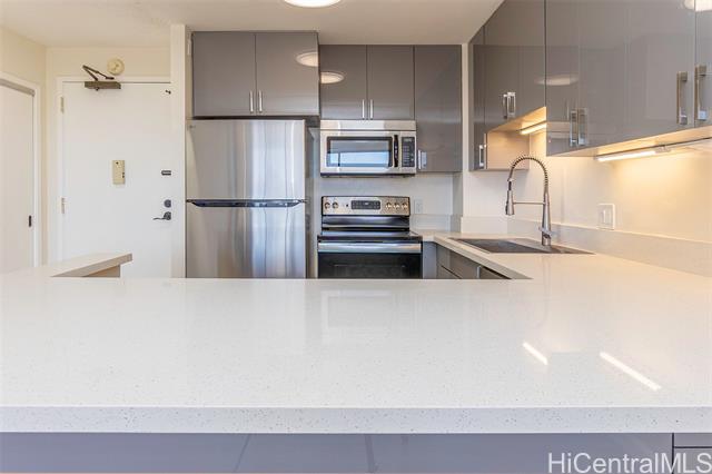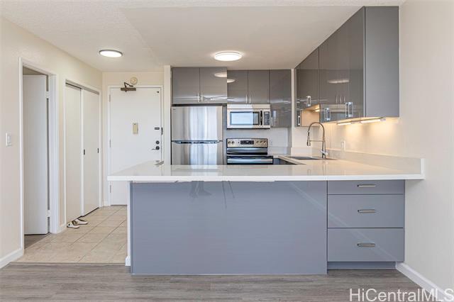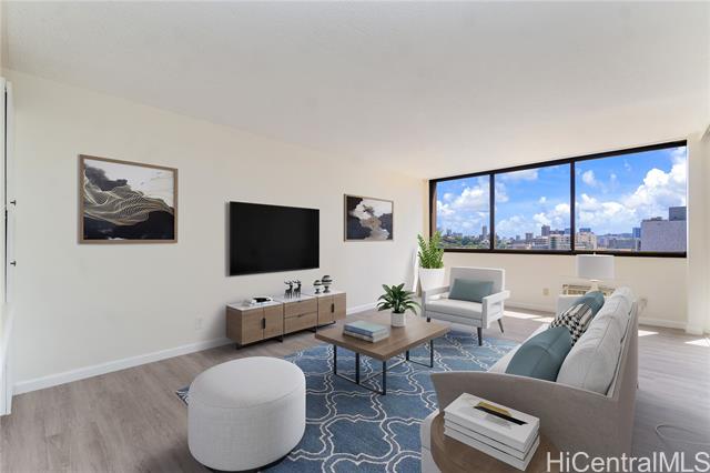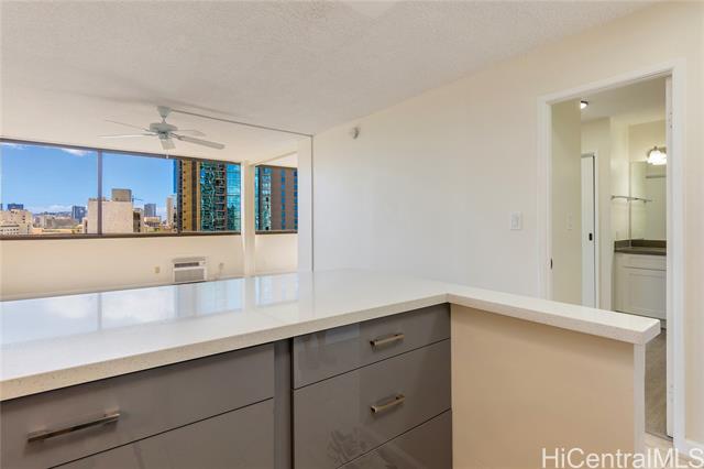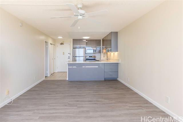 Experience the best of Downtown Honolulu living at Kukui Plaza! This fully renovated 1-bedroom, 1-bathroom condo showcases beautiful mountain and city views and is just steps from restaurants, shopping, offices, bars, and the Hawaii Theatre. The home features a brand-new eat-in kitchen with quartz countertops and stainless steel appliances, new LVP flooring, fresh interior paint, and a stylishly remodeled bathroom with a tiled tub/shower and modern vanity. An assigned covered parking stall is also included. Kukui Plaza offers resort-style amenities including a tranquil private garden, walking paths, fish pond, pool, pergola for gatherings, pantry, and 24-hour security. Don’t miss this opportunity to own a piece of paradise in the heart of Honolulu!