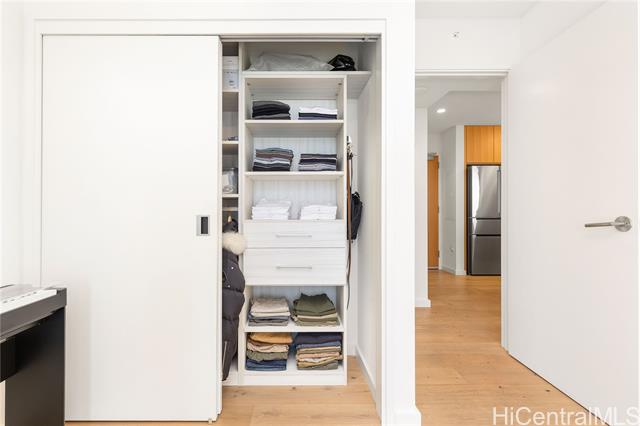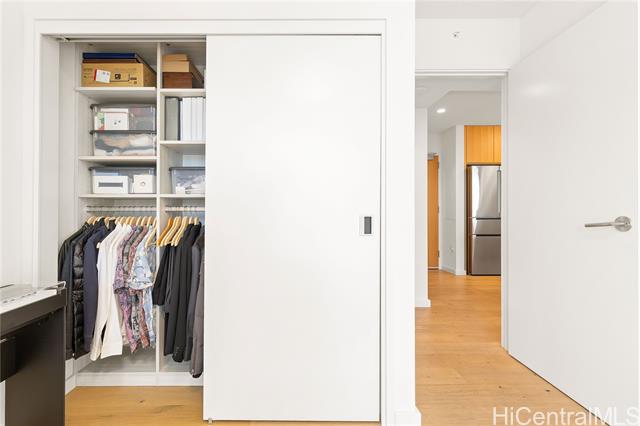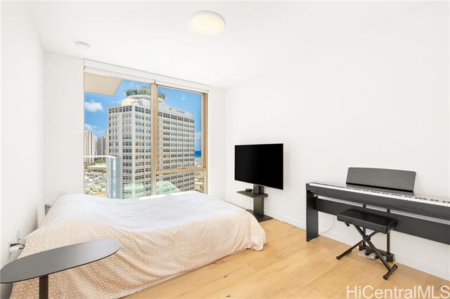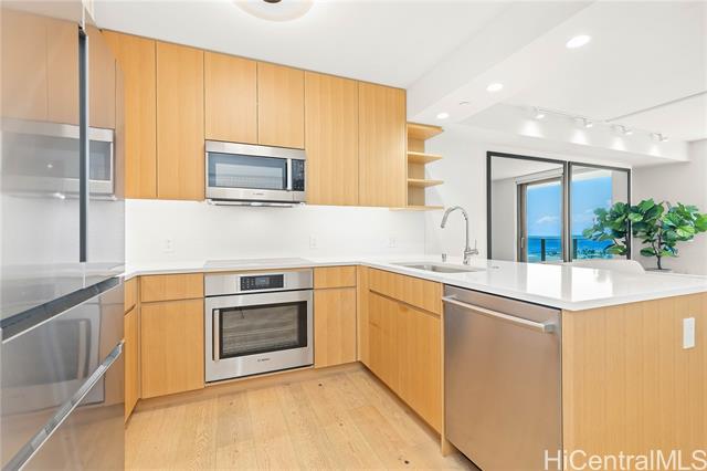 This upgraded residence at Sky Ala Moana West features quality finishes and thoughtful improvements throughout. Quality upgrades include engineered white oak wood flooring, upgraded kitchen and laundry appliance packages, Toto Neorest bidet toilet, California Closet system, and Hunter Douglas roller screen shades. Additional storage provides added convenience. The spacious 99 sf lanai offers ocean views and is perfect for relaxing. Residents enjoy a wide range of resort-style amenities including two pools, a fitness center, spa, BBQ cabanas, dog park, children's play area and multiple private rooms for meetings or celebrations. Conveniently located near Ala Moana Center, dining, shopping and beautiful beaches. The building allows 30-day minimum rental, offering additional flexibility for owners. High end furnishings available for purchase separately.