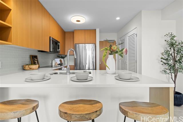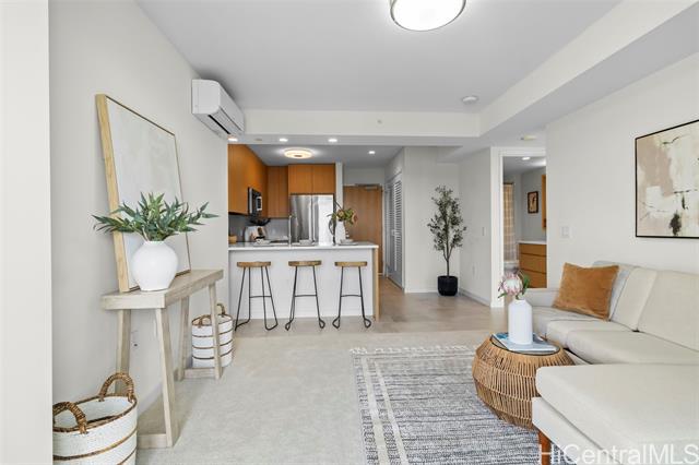 Experience elevated urban living at Sky Ala Moana West, one of Honolulu’s newest and most sought-after residences. This beautifully appointed 1-bedroom, 1-bath home showcases stunning ocean and city views, complemented by a bright, open-concept design and sophisticated finishes throughout.The thoughtfully designed layout features a sleek modern kitchen with premium appliances, seamlessly flowing into the living area—ideal for both comfortable everyday living and effortless entertaining. Step out onto your private lanai to enjoy true indoor-outdoor living while taking in Honolulu’s vibrant skyline and coastal views. Resort-style amenities elevate the experience with a swimming pool, lap pool, saltwater spa, fitness center, sauna, private dining room, BBQ pavilions, poolside cabanas, playground, and dog park—offering a lifestyle that feels like a year-round retreat. Perfect for an owner-occupant seeking modern island living or an investor looking for a highly desirable property in a prime location. Ideally situated across from Ala Moana Center and just a short distance to Ala Moana Beach Park, Waikiki, dining, shopping. Enjoy the best of easy island living in the heart of Honolulu.