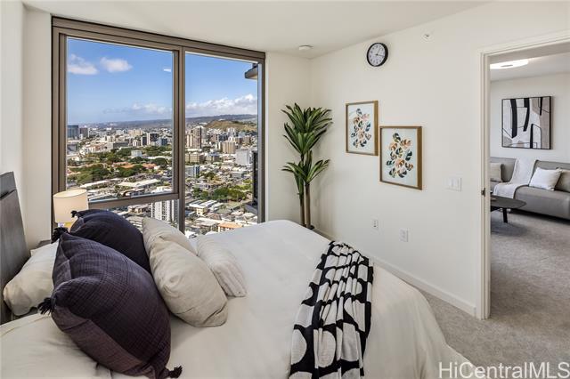 Sky Ala Moana West #3906 – Rare High-Floor Opportunity! 06 unit is offered for the first time above the 35th floor, Residence 3906 is a 2-bedroom, 2-bath layout at Sky Ala Moana West that combines elevated design with panoramic views. Thoughtfully crafted for privacy and versatility, the bedrooms are separated by a spacious living area that includes room for a full-sized dining table—a feature seldom found in this building. The primary suite boasts a dual-sink vanity and a large walk-in closet, one of only two layouts to offer this bonus feature. The second bedroom also includes a walk-in closet, adding to the home’s generous storage. Floor-to-ceiling windows frame sweeping views of Honolulu’s skyline, sparkling night lights, and the majestic Ko‘olau mountains. Residents enjoy resort-style amenities including BBQ cabanas, recreational rooms with full kitchens and outdoor seating, a playground, and a dog run. Plus, complimentary access to hotel-side luxuries: a family pool with jacuzzis, pool bar, lap pool, fitness center, and a full-service spa with saunas, ofuro soaking tubs, and a cold plunge. This is elevated island living—rare, refined, and ready to welcome you home.