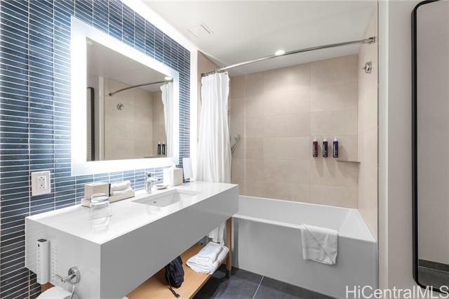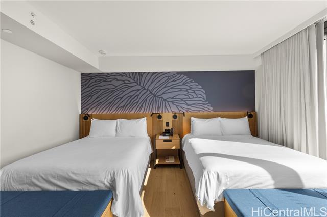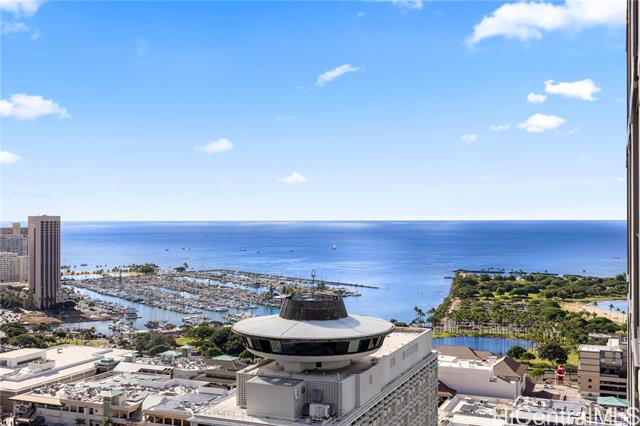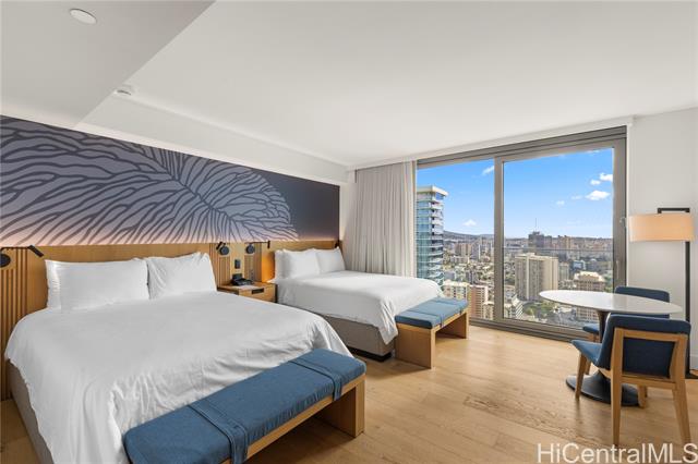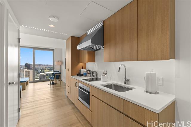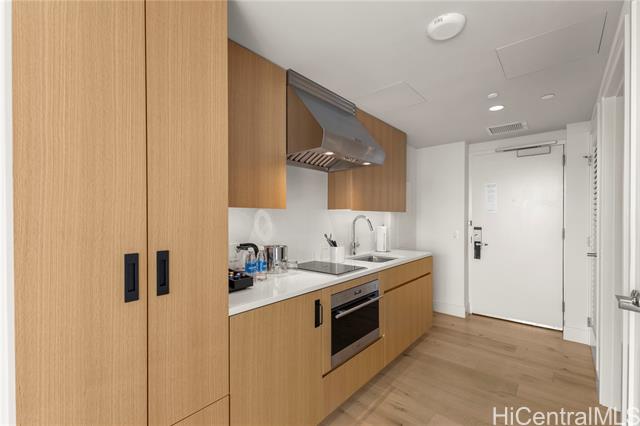 The modern, resort-style studio unit at Sky Ala Moana East, the most recently completed condotel in the vibrant Ala Moana area of Honolulu! It is in a prime location with Ala Moana Shopping Center, as well as various restaurants and shops within a short walking distance. This high floor unit offers a sophisticated and modern atmosphere. The room has a hardwood floor with a kitchenette equipped with Wolf Sub-Zero appliances and a Bosch washer and dryer installed.Enjoy an ocean view as well as city and mountain views. Various amenities such as valet service, two pools, fitness center, BBQ cabanas, a spa, and saunas. This is the turn key property with flexible usage options. You can live in the unit, use it as a hotel, or use it as a vacation home while operating it as a hotel.