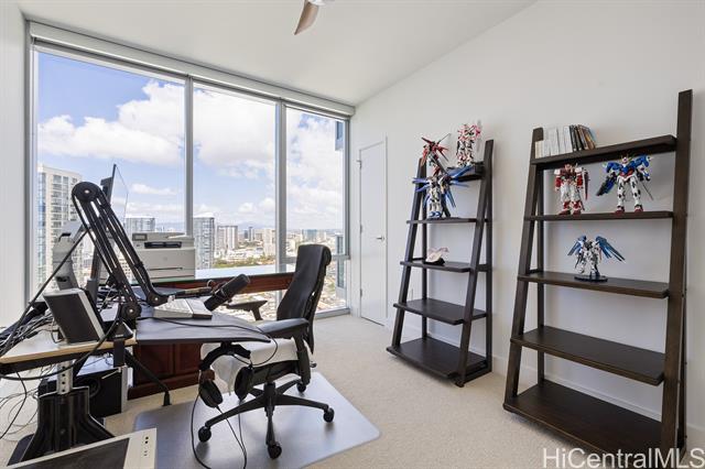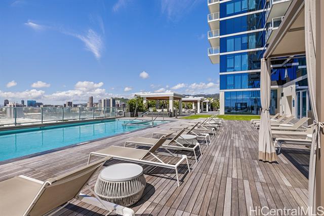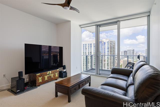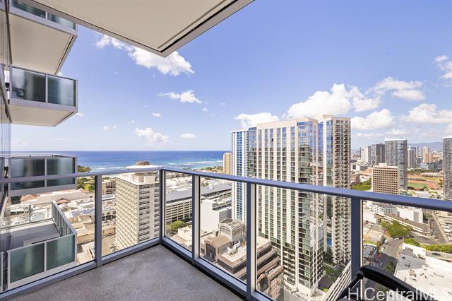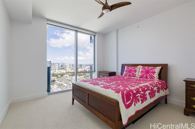 Enjoy luxury convenient living on the 35th floor in Mid town Honolulu. Unit is in Excellent Condition with 9 foot high ceilings with ceiling fans in the bedrooms and living room. Enjoy the ocean and mountain views from the living room, lanai and both bedrooms. Azure offers an exercise room, recreation room, movie theater, 4 grills and 2 cabanas, puppy park, 4 guest rooms for out of town visitors, and concierge services. The unit has two parking stalls and storage. Across the street from Ala Moana Center, Walmart, Sam's Club, great restaurants and much more. Very close to Magic Island and Ala Moana beach. Azure is fully covered with 100% hurricane insurance.