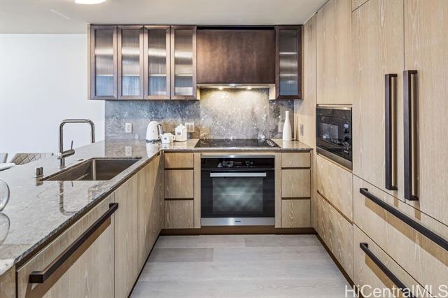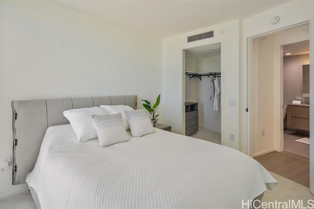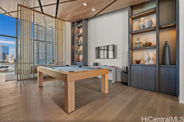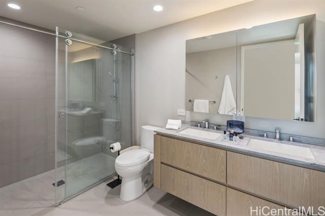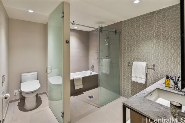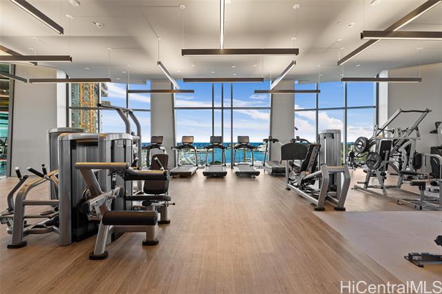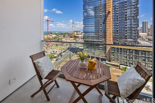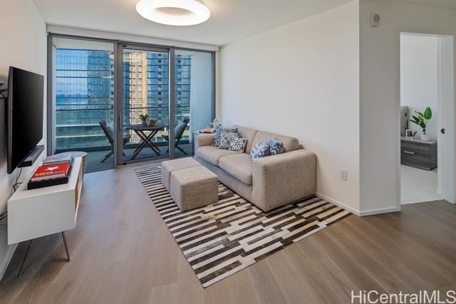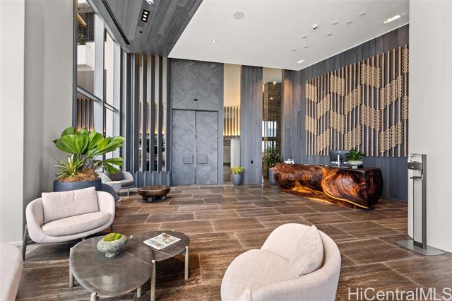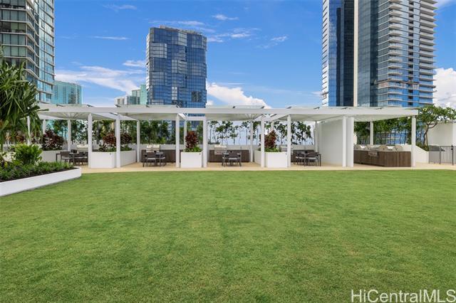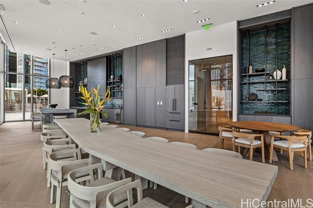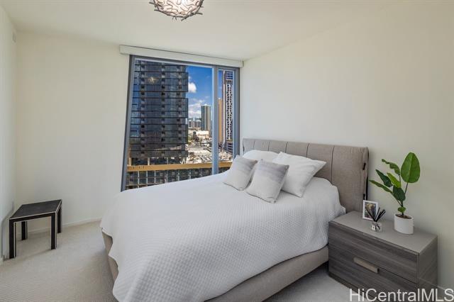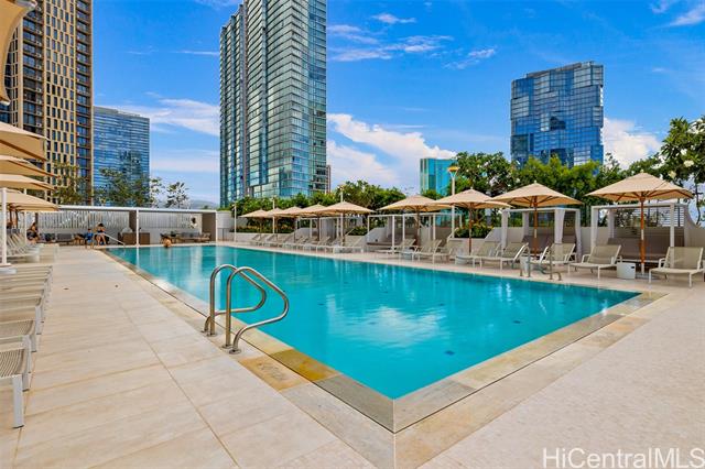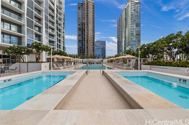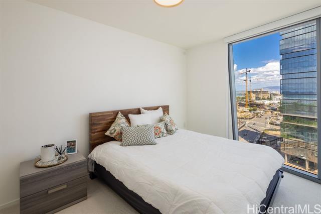 New contemporary two bedroom in outstanding price! Prime location in center of Ward Village, Ala Moana beach, Whole Food, Ala Moana mall and restaurants! This gorgeous unit features a tasteful interior that's highlighted with ocean and mountain views from you own private lanai with easy access to a Ward village park below. Additionally, It’s highly upgraded with designer motorized blinds, upgraded new lighting, beautifully appointed Miele appliances, Samsung HDTV with a Bose sound system set up, spacious bathrooms, central air-conditioning and very generous closet space. The primary bathroom has a freestanding tub with a separate shower enclosure and a private glass door for the toilet area. What also makes this particular unit desirable is the weather protected parking location with 2 roomy side by side stalls! Outstanding amenities include: the Private and grand party Room, Sauna and treatment Room, Pool Side Cabanas, two Jacuzzis, BBQ Pavilions, and a world class Fitness Gym
