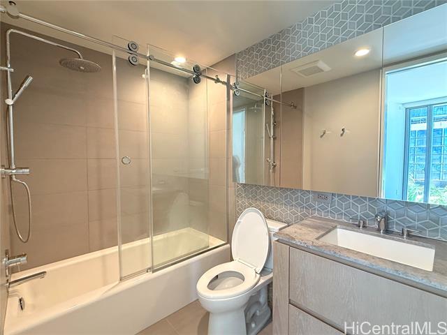 This one bedroom, one bath tower residence features high ceiling and open concept floorpan with a sliding door separating the living room and bedroom. Views of Victoria Ward Park and Kewalo Basin are available through floor to ceiling glass windows and a private lanai. The kitchen is equipped with custom wood cabinets an natural stone countertops, with hardwood flooring throughout most living spaces and ceramic tile flooring in the bath. The primary bedroom features a California Closet system and roller shades throughout the residence. Amenities include a fitness center, private dining room, a children's play area and a sunset bar and lounge. Residents have access to a 25 yard lap pool, two oversized spas, Chefs and catering kitchen, and dining and barbecue pavilion. Property is located within Ward Village community. It offers proximity to shops, restaurants, entertainment, Ala Moana shopping Center and Ala Moana Beach Park.