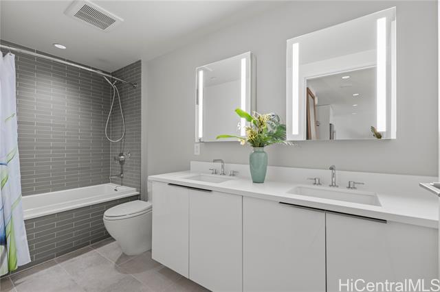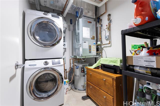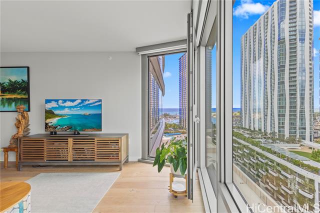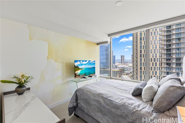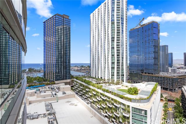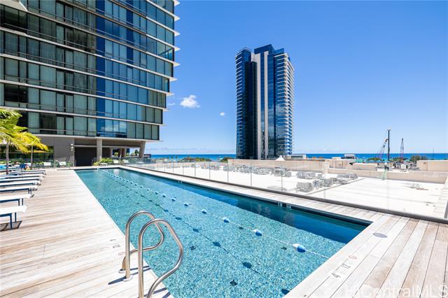 Excellent 1/1 home at Ae'o with ocean, harbor and mountain views! At 739sf, this is the largest 1/1 offered at the lowest price/sf. This must-see unit has premium Bosch stainless steel appliances, spacious bathroom with deep soaking tub, custom built-ins in kitchen and walk-in closet, engineered hardwood floors, floor-to-ceiling windows and bump out window/door for fresh air. Unit also comes with a full size W/D in the extra utility room and one parking stall with a separate storage unit. Resort-like amenities include a 24/7 hosted front desk, rooftop terrace, lap and family pool, fitness center, locker rooms with sauna and steam room, theater, play ground, guest suites, outdoor bbq, dining cabanas. This Ward Village condo features the best of urban lifestyle in paradise with direct access to Whole Foods market, numerous dining and entertainment options, beaches, shopping, Consolidated Theaters, Ala Moana Shopping Center all within a few blocks! Condo is pictured fully furnished for staging purposes only; it is currently vacant and easy to show. The information herein may contain inaccuracies and is provided without warranty or guaranty of any kind.