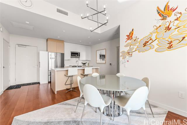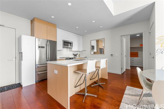 BEST VALUE & LARGEST 2-Bedroom 08-Stack Penthouse-Level Residence in Ae'o. Located on the preferred Diamond Head side, this penthouse-level home offers PH higher ceilings and a noticeably more open, premium feel. One of only a limited number of 2-bedroom residences built at 1,092 sq ft, #3908 provides meaningfully more living space than other penthouse 2BR offerings currently on the market. Floor-to-ceiling windows frame ocean, coastline, city, mountain, and sunrise views while capturing cool tradewinds and balanced natural light throughout the day. The well-designed split-bedroom layout features a contemporary kitchen, quartz countertops, and Bosch appliances, along with quality wood flooring throughout living areas and bedrooms, motorized window drapes, Toto washlets, and central A/C. Two parking stalls, featuring a secure mezzanine stall and a convenient fourth-floor stall, plus a large deeded storage room nearby. Ae'o offers resort-style amenities, pet-friendly, and direct private access to Whole Foods, all in the heart of Ward Village near Ala Moana Beach Park, shopping, dining, and entertainment.