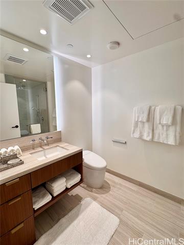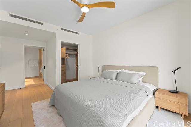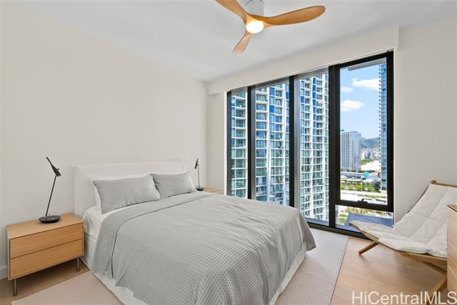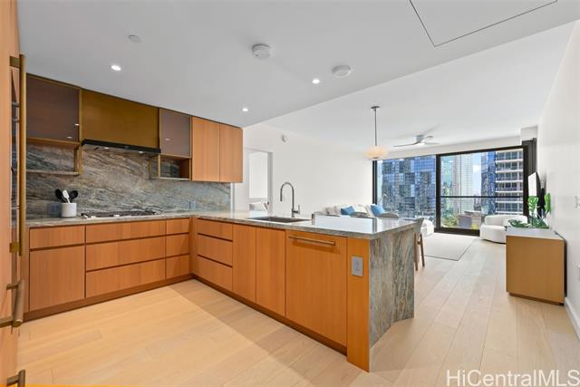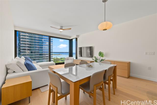 Be the first to reside in this pristine high-floor corner unit at Victoria Place, Honolulu's newest front-row luxury tower. The coveted '10 stack is prized for its corner position and setback from Ala Moana Blvd., offering unobstructed ocean views and privacy. Designed by Solomon Cordwell Buenz with landscaping by VITA Planning & Landscape Architecture, Victoria Place embodies modern island elegance with lush tropical grounds and resort-style amenities—multiple pools, hot/cold plunge spas, gym, yoga/pilates studio, wine cave, private dining with chef’s kitchen, theater, guest suites, and a clubhouse with its own pool. 24-hour concierge and valet service ensures effortless living. This residence features Studio Becker cabinetry, Sub-Zero and Wolf appliances, floor-to-ceiling windows, and two side-by-side parking stalls on the preferred 3rd floor. Offered fully furnished, move-in ready, with upgrades including automatic blackout shades, 2 Neorest Toto toilets, and EV charging. With its premier positioning, designer finishes, and turn-key presentation, Residence 1710 captures the essence of elegant and modern Hawaiian urban living at one of Honolulu’s most prestigious addresses.