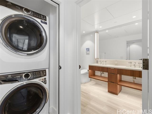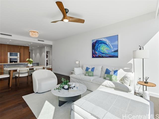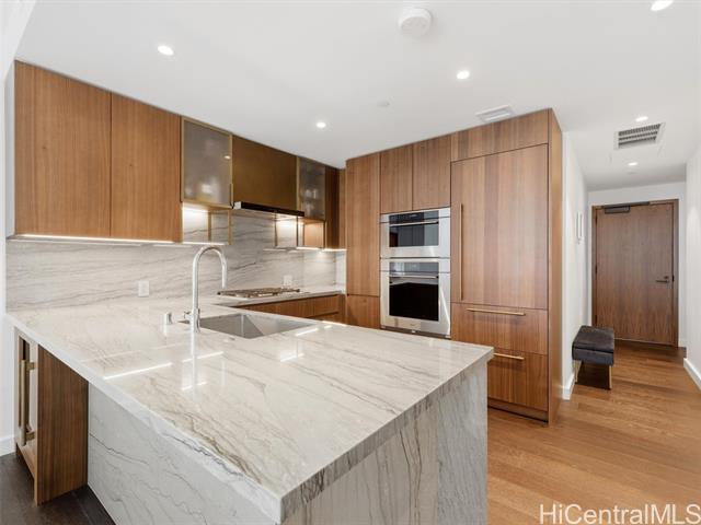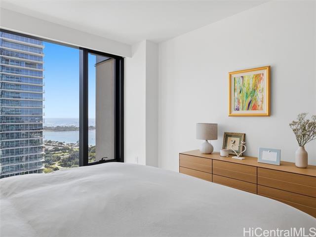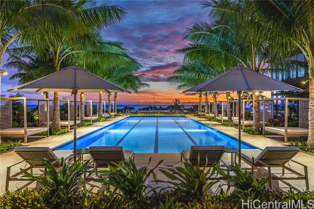 Spacious one-bedroom residence at Victoria Place, the newest front-row luxury building in Ward Village. This beautifully designed home features ocean, harbor, park, and sunset views. Thoughtful upgrades include Custom Closet Systems by Inspired Closets, Motorized Shades, TOTO Washlet, ceiling fan and light fixture in the living room. High-end finishes include Studio Becker cabinetry, Wolf and Sub-Zero appliances, gas cooktop, wine refrigerator, and Electrolux washer/dryer. Wood flooring throughout is complemented by natural stone countertops and tile finishes. Residents enjoy exceptional resort-style amenities including three swimming pools, the Lauhala Pool House for private gatherings, a full spa with hot tub, cold plunge, steam and sauna rooms, private dining and chef’s kitchen, wine cave, theater, meeting rooms, barbecue pavilions, and guest suites. Experience the best of coastal Kaka‘ako living at Victoria Place.