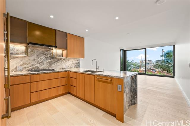 Luxury one bedroom residence at Victoria Place, the newest front row building in Ward Village. This beautifully designed home showcases ocean, harbor, park and sunset views. High end finishes include: Studio Becker cabinets, Wolf and Subzero appliances, gas stove, wine fridge and Electrolux washer/dryer. Wood flooring throughout with natural stone counter and tiles. Upgrades include motorized shades and a custom closet system. Enjoy resort-style amenities including three swimming pools, Lauhala Pool House for private gatherings, spa with hot tub, cold plunge, steam and sauna rooms, private dining, chef's kitchen, wine cave, theater, meeting rooms, barbecue pavilions, and guest suites. Experience the best of Kaka‘ako living.