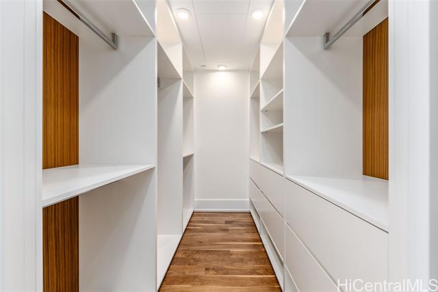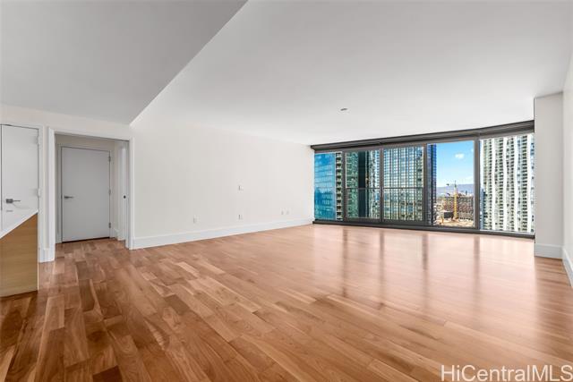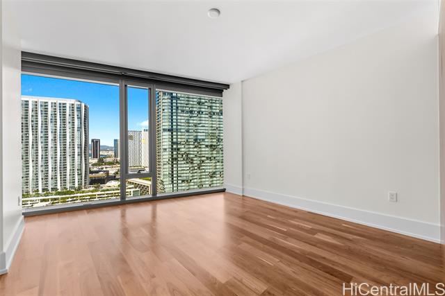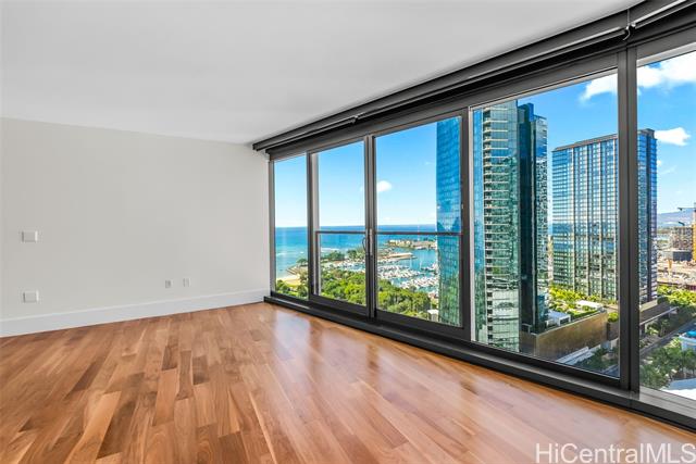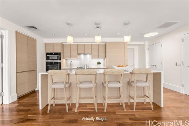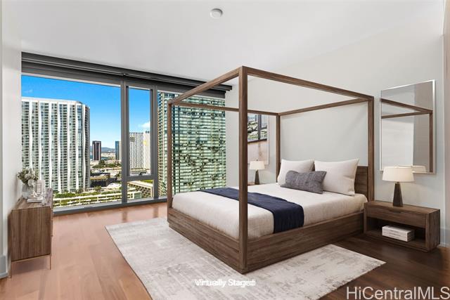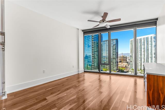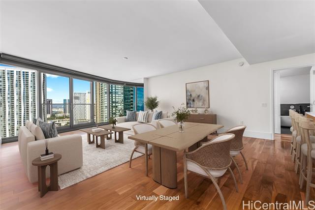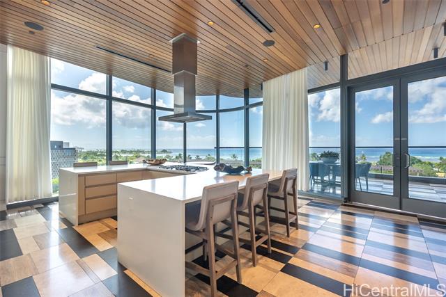 Exceptional 2-bedroom, 2-bath residence in Ward Village, a master-planned community attracting both local and global residents with its blend of urban convenience and modern refinement. This larger 2 bedroom condo offers an open-concept floor plan, ideal for entertaining, and features high ceilings throughout. The chef’s kitchen is equipped with Miele appliances, including a gas range and wine refrigerator, and a breakfast bar with upgraded pendant lighting. Additional features include a separate laundry room with built-in shelves, upgraded wood floors in the bedrooms, motorized shades throughout and an air-conditioned storage room (on the 5th floor). Enjoy stunning views of the ocean by day and twinkling city lights by night from almost every room. Residents have access to world-class amenities, including a glass-bottom pool, whirlpool, tennis court, golf simulator, BBQ cabanas, a chef's kitchen and dining room, gym, theatre, guest suites and other amenities that rival white-glove condos in other global luxury markets. Conveniently located within minutes to Whole Foods, beaches, the marina, Urgent Care and hospitals, shopping and dining.