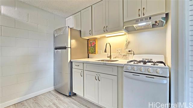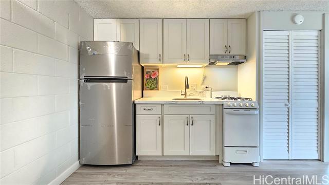HIGHLY RENOVATED in 2025 with BRAND NEW kitchen & bath cabinets, counter tops, sink, vinyl plank laminate flooring, paint, bedroom & bathroom vinyl single hung windows, reglazed bathtub, lowered bedroom partition, mirrored closet doors, refrigerator, toilet, light fixtures, AC, curtains, sliding screen door. 1 year old gas range. Fee Simple 1 bedroom in central & convenient location close to Ala Moana, Safeway, beach, etc. with low maintenance fees of $464 which includes hot water, water, gas and sewer. 1 assigned covered parking stall. Community laundry on first floor. Rycroft Manor is fully insured, Buyer to verify.