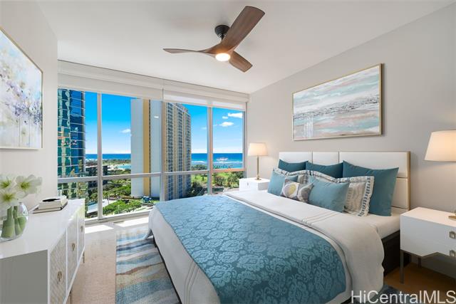 Enjoy the coastal lifestyle of Waihonua - 3 bedroom, 2 bathroom ocean view, corner unit in the prestigious Ala Moana, Ward Village area in the heart of Honolulu. The unit is beautifully upgraded with European designer countertops, new appliances, designer lighting fixtures, fully built-in closet systems, seamless blackout blinds and hardwood flooring! World class amenities include: chef's kitchen in club room, fitness center, yoga and private workout studio, spa, pool, theater, BBQ cabanas & guest suites! All in a perfect location for an active lifestyle, steps away from Ala Moana beach, Whole Foods, shopping & restaurants! 3-bedrooms are rarely available at this great value!